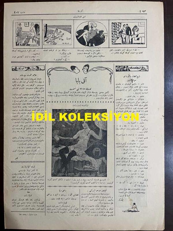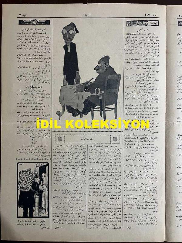 Osmanlıca Akbaba Mizah Dergisi-Gazetesi, Orijinal Dönem Basım, (Ottoman Magazine-Newspaper) - 27 Kasım 1924 - Sayı: 207 - Rumi: 27 Teşrin-i Sani 1340 - Karikatürist Ramiz Gökçe'nin Ali Fethi Okyar Temalı Çalışması: Başvekil ve Müdafaa-i Milliye Vekili Fethi Bey Mecliste Hükümet Beyannamesini Okurken! - Laklakiyat: Haftanın Panoraması - Refik Halit (Karay)'in Bir Nüktesi Daha: Edebiyat-ı Cedide Erkanından Ali Ekrem (Bolayır) Bey Hakkında Refik Halit Merhumun Zarif Bir Sözünü Hikaye Ettiler - Küçük Hikaye: Prensin Gözdesi - Üstad-ı Azam'ın Bir Nüktesi: Florinalı Nazım Bey, Üstad-ı Azam Abdülhak Hamit (Tarhan)'e Bundan Birkaç Ay Evvel, Yeni Bir Eserini Götürüp Bir Takriz Yazmasını Rica Eder - Ratip Tahir Burak'ın Karikatürleri - Zamane Hizmetçileri - Tahir Nadi Efendi'nin Kurnazlığı - Fransızca Sourire'den Bir Karikatür "Namuslu Kadınlarla Aramızda Büyük Bir Fark Yok" - Ecnebi Karikatürleri, Yusuf Ziya (ORTAÇ) tarafından kaleme alınmıştır. Kitap 1924 [Rûmi: 1340] yılında [İstanbul] yayınlanmıştır. Satışta olan kitap, yayınevinin 207. baskısıdır. 4 sayfadır. Osmanlıca Akbaba Mizah Dergisi-Gazetesi, Orijinal Dönem Basım, (Ottoman Magazine-Newspaper) - 27 Kasım 1924 - Sayı: 207 - Rumi: 27 Teşrin-i Sani 1340 - Karikatürist Ramiz Gökçe'nin Ali Fethi Okyar Temalı Çalışması: Başvekil ve Müdafaa-i Milliye Vekili Fethi Bey Mecliste Hükümet Beyannamesini Okurken! - Laklakiyat: Haftanın Panoraması - Refik Halit (Karay)'in Bir Nüktesi Daha: Edebiyat-ı Cedide Erkanından Ali Ekrem (Bolayır) Bey Hakkında Refik Halit Merhumun Zarif Bir Sözünü Hikaye Ettiler - Küçük Hikaye: Prensin Gözdesi - Üstad-ı Azam'ın Bir Nüktesi: Florinalı Nazım Bey, Üstad-ı Azam Abdülhak Hamit (Tarhan)'e Bundan Birkaç Ay Evvel, Yeni Bir Eserini Götürüp Bir Takriz Yazmasını Rica Eder - Ratip Tahir Burak'ın Karikatürleri - Zamane Hizmetçileri - Tahir Nadi Efendi'nin Kurnazlığı - Fransızca Sourire'den Bir Karikatür "Namuslu Kadınlarla Aramızda Büyük Bir Fark Yok" - Ecnebi Karikatürleri adlı eser Osmanlıca dilindedir.