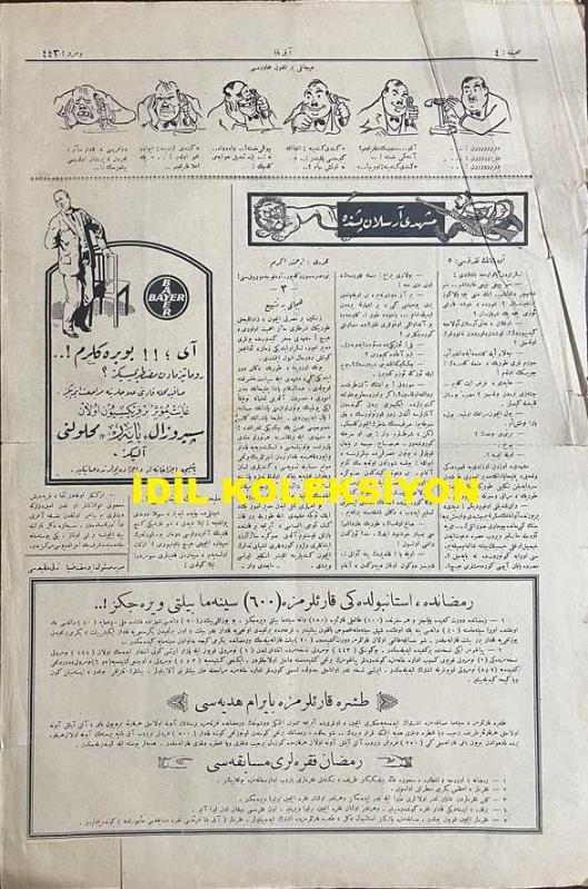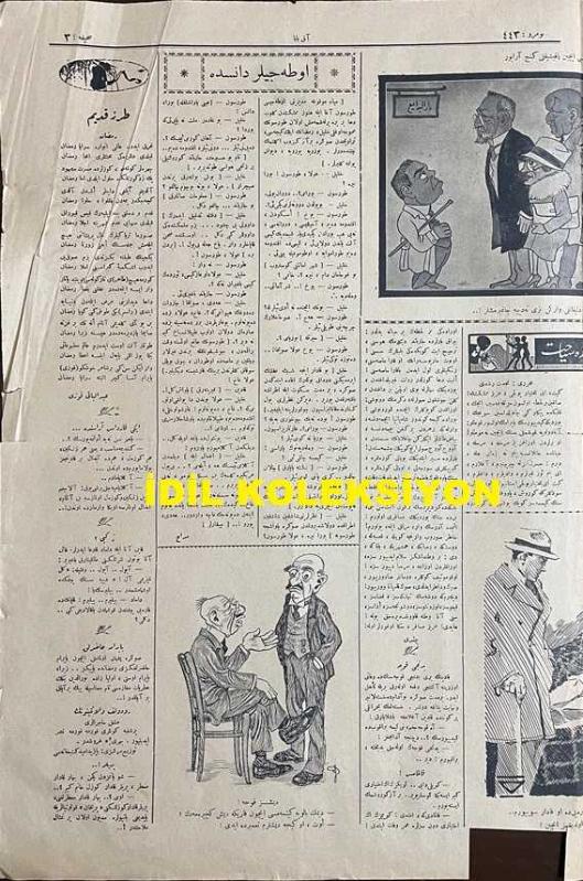 Osmanlıca Akbaba Mizah Dergisi-Gazetesi, Orijinal Dönem Basım, (Ottoman Magazine-Newspaper) - 3 Mart 1927 - Sayı: 443 - Karikatürist Ramiz Gökçe'nin Josef Stalin'i Tasvir Eden Çalışması: Rusya Emperyalizmi, İngiltere Bolşevizmi Yıkmaya Çalışıyor.. "Altta Kalanın Canı Çıksın!" - "Kabahat Kimde?" Akbaba - Fukara Müsabakası - "Dost Nasihati" Karga - Manzum Tefrika: "İstanbul'da Seyahat" Muharriri: Necdet Rüştü (Efe) - Karikatürist Ramiz Gökçe'nin Çalışması: Darülbedayi Temsil Edeceği Hamlet Trajedisi İçin Yakışıklı Genç Arıyor "Hep Birden: Allah Allah, Darülbedayi'de Bu Güzel Delikanlı Varken Bizi Ne Diye Çağırmışlar!.." - "Odacılar Dansta" Meddah - Tarz-ı Kadim "Ramazan" Abdülbaki Fevzi (Uluboy) - Akbaba'nın Tefrikası: "Meşhedi Arslan Peşinde" Muharriri: Ercüment Ekrem (Talu) - Dış Basından Karikatür: Heyecanlı Bir Telefon Muhaveresi adlı eser, Kitap > Süreli Yayınlar > Gazeteler > Türkiye > Genel kategorisinde İkinci El olarak satıştadır.