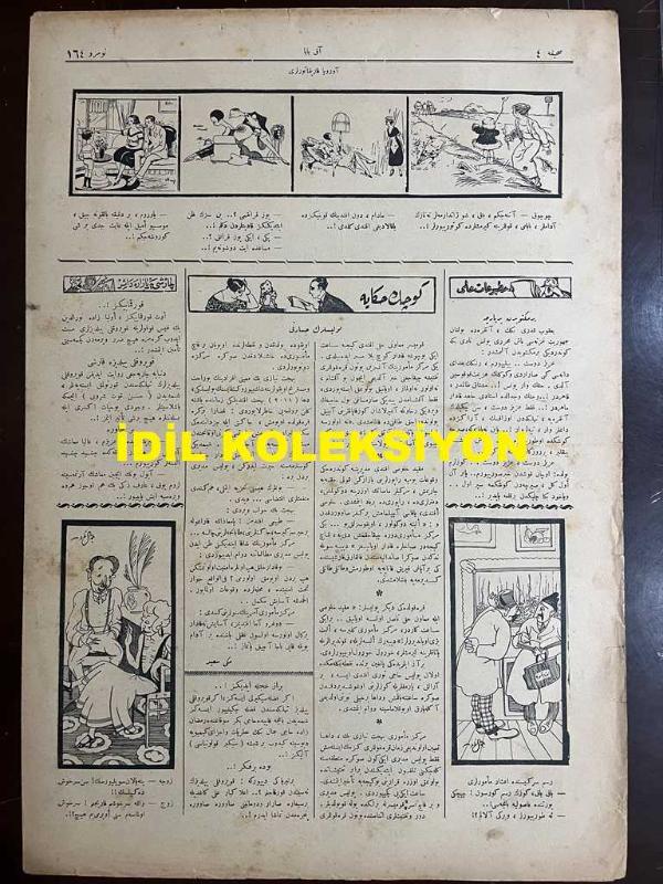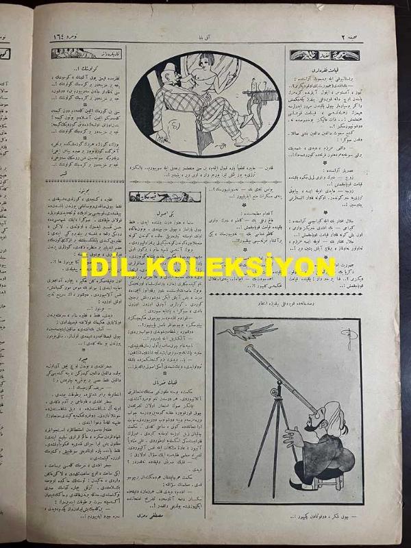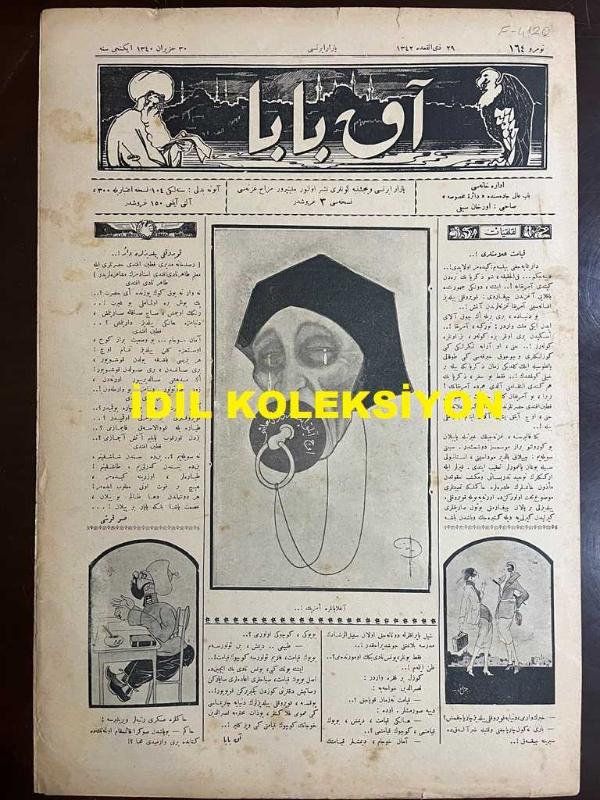 Osmanlıca Akbaba Mizah Dergisi-Gazetesi, Orijinal Dönem Basım, (Ottoman Magazine-Newspaper) - 30 Haziran 1924 - Sayı: 164 - Rumi: 30 Haziran 1340 - Hicri: 29 Zilkade 1342 - Karikatürist Ramiz Gökçe'nin Çalışması: Üç Aylık Eytam ve Eramil Maaşı "Ağlayanlara Emzik!.." - Laklakiyat: Kıyamet Alametleri "Şu Zekeriya Bey Nereden Gitti Amerika'ya!.. İşte Dünkü Cumhuriyet'te Baklayı Ağzından Çıkardı: Kuyruklu Yıldız Efsanesini Amerika Gazetelerinden Almış!.." - Kuyruklu Yıldızlara Dair - Fıkralar: Kıyamet Fıkraları - Cemal Nadir Güler'in Karikatürleri - Küçük Hikaye: "Tuluat" Selami İzzet (Sedes) - Şundan Bundan: Falih Rıfkı (Atay) Bey'in Fransızcası - Kürt Hakkı İle Mülakat: Kara Listeye Dahil Olan Kürt Hakkı İle Polis Müdüriyetinde Yapılan Görüşme - Matbuat Alemi: Bir Mektuptan Bir Parça "Yakup Kadri (Karaosmanoğlu) Bey'in, Ankara'da Bulunan Cumhuriyet Gazetesi Baş Muharriri Yunus Nadi Bey'e Gönderdiği Bir Mektuptan Alınmıştır - Küçük Hikaye: Polislerin Cesareti adlı eser, Kitap > Süreli Yayınlar > Gazeteler > Türkiye > Genel kategorisinde İkinci El olarak satıştadır.