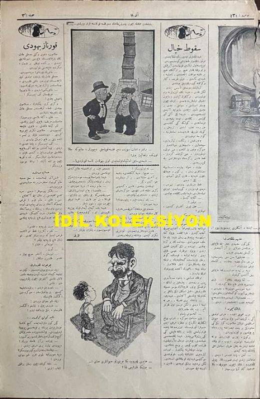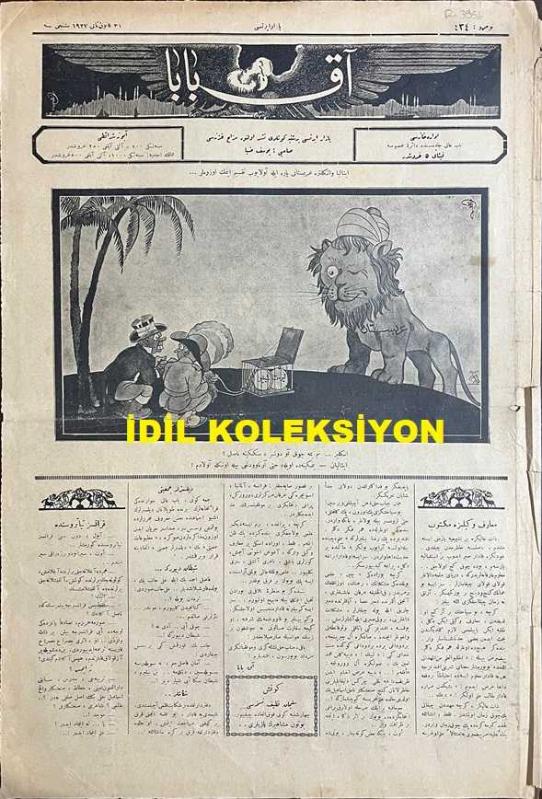 Osmanlıca Akbaba Mizah Dergisi-Gazetesi, Orijinal Dönem Basım, (Ottoman Magazine-Newspaper) - 31 Ocak (Kanun-i Sani) 1927 - Sayı: 434 - Karikatürist Ramiz Gökçe'nin Çalışması: İtalya ve İngiltere Arabistan'ı Para ile Avlayıp Taksim Etmek Üzereler... "İngiliz: Benim Yeme Çok Av Düşer, Seninkine Nasıl? İtalyan: Benimkine de Öyle, Hatta Arnavutluk'u Bile Onunla Avladım!" - Maarif Vekilimize Mektup Akbaba - "Karışık Bir Dava" Çekirge (Ercüment Ekrem Talu) - "Müdafaa-i Nefis" Selami İzzet (Sedes) - Karikatürist Ramiz Gökçe'nin Çalışması: Yemiş'ten Unkapanı'na Kadar Olan Sahildeki Caddeler, Deniz Suları Altında Kalıyor (Gazeteler) "İlahi Herif.. Bu Ne Kıyafet, Hangi Şıllığın Uğruna Kendini Denize Attın? Vallahi Değil, Karıcığım, Denizde İntihar Etmedim, Yemiş'ten Unkapanı'na Kadar Yürüyerek Geldim de.." - Karikatürist Ramiz Gökçe'nin Çalışması: "Sanatkarlar Birliği'ne Alay Köşkü Tahsis Edilmiş, Acaba Neden? Anlamayacak Ne Var, Bizdeki Sanatkarların Hepsi Alaydan Yetişme de Ondan!", Yusuf Ziya (ORTAÇ) tarafından kaleme alınmıştır. Kitap 1927 yılında [İstanbul] yayınlanmıştır. Satışta olan kitap, yayınevinin 434. baskısıdır. 4 sayfadır. Osmanlıca Akbaba Mizah Dergisi-Gazetesi, Orijinal Dönem Basım, (Ottoman Magazine-Newspaper) - 31 Ocak (Kanun-i Sani) 1927 - Sayı: 434 - Karikatürist Ramiz Gökçe'nin Çalışması: İtalya ve İngiltere Arabistan'ı Para ile Avlayıp Taksim Etmek Üzereler... "İngiliz: Benim Yeme Çok Av Düşer, Seninkine Nasıl? İtalyan: Benimkine de Öyle, Hatta Arnavutluk'u Bile Onunla Avladım!" - Maarif Vekilimize Mektup Akbaba - "Karışık Bir Dava" Çekirge (Ercüment Ekrem Talu) - "Müdafaa-i Nefis" Selami İzzet (Sedes) - Karikatürist Ramiz Gökçe'nin Çalışması: Yemiş'ten Unkapanı'na Kadar Olan Sahildeki Caddeler, Deniz Suları Altında Kalıyor (Gazeteler) "İlahi Herif.. Bu Ne Kıyafet, Hangi Şıllığın Uğruna Kendini Denize Attın? Vallahi Değil, Karıcığım, Denizde İntihar Etmedim, Yemiş'ten Unkapanı'na Kadar Yürüyerek Geldim de.." - Karikatürist Ramiz Gökçe'nin Çalışması: "Sanatkarlar Birliği'ne Alay Köşkü Tahsis Edilmiş, Acaba Neden? Anlamayacak Ne Var, Bizdeki Sanatkarların Hepsi Alaydan Yetişme de Ondan!" adlı eser Osmanlıca dilindedir.