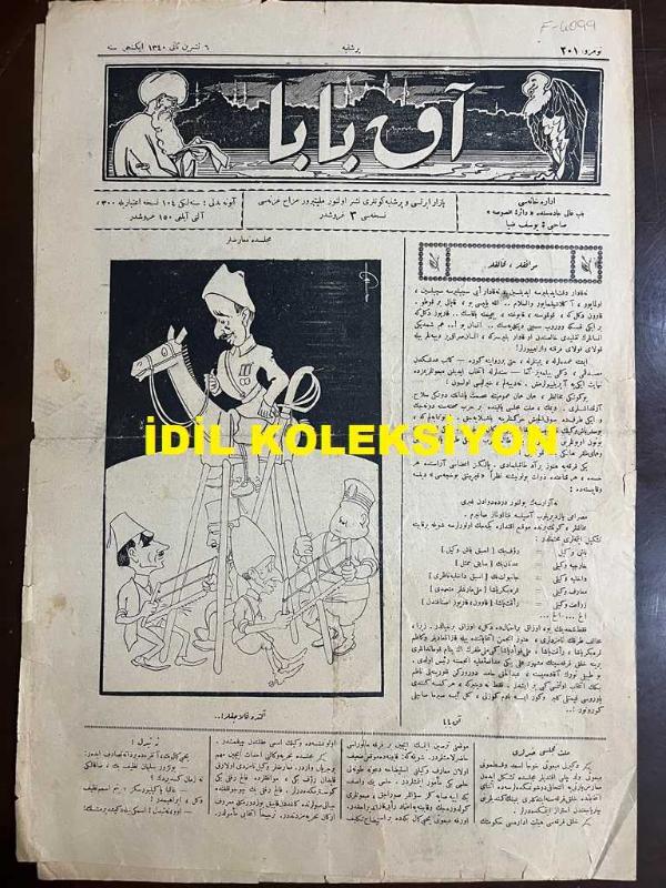 Osmanlıca Akbaba Mizah Dergisi-Gazetesi, Orijinal Dönem Basım, (Ottoman Magazine-Newspaper) - 6 Kasım 1924 - Sayı: 201 - Rumi: 6 Teşrin-i Sani 1340 - Karikatürist Ramiz Gökçe'nin İsmet İnönü Temalı Çalışması: Mecliste Muarızlar "Altta Kalacaklar!.." - Muvaffaklar, Muhalifler: Mebuslarımız da Nihayet İkiye Ayrılıyorlarmış. Bugünkü Muhalifler, Hemen Hemen Umumiyetle İsmet Paşa'nın Dünkü Silah Arkadaşları. Demek, Millet Meclisi Yakında Bir Harp Sahnesine Dönecek ve İki Taraf da Sevkülceyş Hareketlerine Başlayacak. Unutmayalım ki, Bu Sefer Başvekilin Karşısına Çıkanlır Türk Erkan-ı Harpleridir. Eski Kumandanın Bütün Oyunlarını Bilirler. Bakalım Tali-i Harp Hangi Tarafa Yar Olacak ve Hüma-yı Zafer Hangi Başa Konacak! Yeni Fırkaya Henüz Bir Ad Takılmadı" - Küçük Hikaye: Bir Muamma - Ratip tahir Burak'ın Karikatürü: Sahne-i Tababette Maymun Oynatan Asri Macuncu Baba Operatör Kemal Bey - Tarz-ı Kadim: "Atılmış Gazel" Halil Nihat (Boztepe), "Bulunmuş Gazel" Fazıl Ahmet (Aykaç), Yusuf Ziya (ORTAÇ) tarafından kaleme alınmıştır. Kitap 1924 [Rûmi: 1340] yılında [İstanbul] yayınlanmıştır. Satışta olan kitap, yayınevinin 201. baskısıdır. 4 sayfadır. Osmanlıca Akbaba Mizah Dergisi-Gazetesi, Orijinal Dönem Basım, (Ottoman Magazine-Newspaper) - 6 Kasım 1924 - Sayı: 201 - Rumi: 6 Teşrin-i Sani 1340 - Karikatürist Ramiz Gökçe'nin İsmet İnönü Temalı Çalışması: Mecliste Muarızlar "Altta Kalacaklar!.." - Muvaffaklar, Muhalifler: Mebuslarımız da Nihayet İkiye Ayrılıyorlarmış. Bugünkü Muhalifler, Hemen Hemen Umumiyetle İsmet Paşa'nın Dünkü Silah Arkadaşları. Demek, Millet Meclisi Yakında Bir Harp Sahnesine Dönecek ve İki Taraf da Sevkülceyş Hareketlerine Başlayacak. Unutmayalım ki, Bu Sefer Başvekilin Karşısına Çıkanlır Türk Erkan-ı Harpleridir. Eski Kumandanın Bütün Oyunlarını Bilirler. Bakalım Tali-i Harp Hangi Tarafa Yar Olacak ve Hüma-yı Zafer Hangi Başa Konacak! Yeni Fırkaya Henüz Bir Ad Takılmadı" - Küçük Hikaye: Bir Muamma - Ratip tahir Burak'ın Karikatürü: Sahne-i Tababette Maymun Oynatan Asri Macuncu Baba Operatör Kemal Bey - Tarz-ı Kadim: "Atılmış Gazel" Halil Nihat (Boztepe), "Bulunmuş Gazel" Fazıl Ahmet (Aykaç) adlı eser Osmanlıca dilindedir.