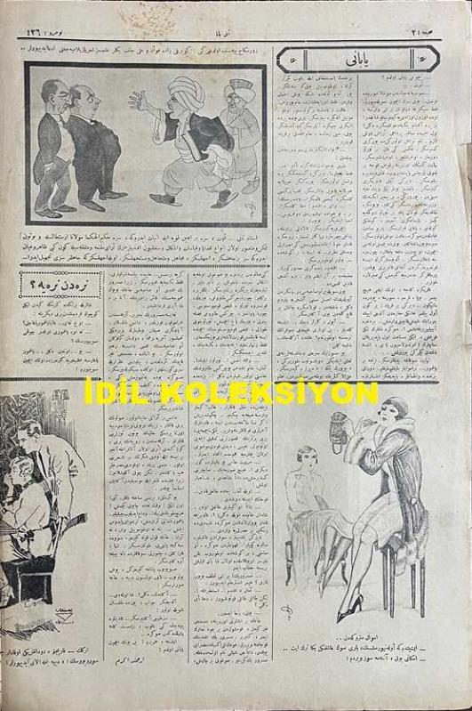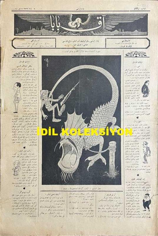 Osmanlıca Akbaba Mizah Dergisi-Gazetesi, Orijinal Dönem Basım, (Ottoman Magazine-Newspaper) - 7 Şubat 1927 - Sayı: 436 - Karikatürist Ramiz Gökçe'nin Çalışması: Çin, Kendisine Musallat Olan İngilizi Yutmak Üzere.. "Çin Ejderi: İçimize Girmek İstiyordun... Buyur!" - "Dedikodular" Karikatürler: Sait Hikmet Bey, Haşim Nahit Bey, İsmail Safa Bey, Sipahi Ocağı Reisi Sami Paşa, Osmanzade Hamdi Bey - "Yabani" Ercüment Ekrem (Talu) - Karikatürist Ramiz Gökçe'nin Çalışması: Zor Nikah Piyesi'nde Olduğu Gibi: Köprülüzade Fuat ve Ali Canip Beyler İlimsiz Şiir Yazılamayacağını İddia Ediyorlar... - "Pala Bıyıklı Adam" Serazad - "Meşhedi ile Doktor" Çekirge (Ercüment Ekrem Talu) - Akbaba'nın Tefrikası: "Gün Doğmayınca" Muharriri: Ercüment Ekrem (Talu) - Fransızca Rire'den: Sarhoş Amerikalılar... "Kadın: Çok Güzel Dans Ediyorlar Ama, Bu çarlistondan da Güç!..." adlı eser, Kitap > Süreli Yayınlar > Gazeteler > Türkiye > Genel kategorisinde İkinci El olarak satıştadır.