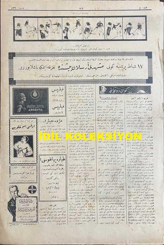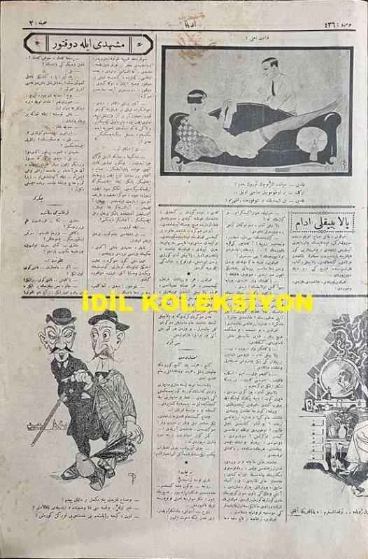 Osmanlıca Akbaba Mizah Dergisi-Gazetesi, Orijinal Dönem Basım, (Ottoman Magazine-Newspaper) - 7 Şubat 1927 - Sayı: 436 - Karikatürist Ramiz Gökçe'nin Çalışması: Çin, Kendisine Musallat Olan İngilizi Yutmak Üzere.. "Çin Ejderi: İçimize Girmek İstiyordun... Buyur!" - "Dedikodular" Karikatürler: Sait Hikmet Bey, Haşim Nahit Bey, İsmail Safa Bey, Sipahi Ocağı Reisi Sami Paşa, Osmanzade Hamdi Bey - "Yabani" Ercüment Ekrem (Talu) - Karikatürist Ramiz Gökçe'nin Çalışması: Zor Nikah Piyesi'nde Olduğu Gibi: Köprülüzade Fuat ve Ali Canip Beyler İlimsiz Şiir Yazılamayacağını İddia Ediyorlar... - "Pala Bıyıklı Adam" Serazad - "Meşhedi ile Doktor" Çekirge (Ercüment Ekrem Talu) - Akbaba'nın Tefrikası: "Gün Doğmayınca" Muharriri: Ercüment Ekrem (Talu) - Fransızca Rire'den: Sarhoş Amerikalılar... "Kadın: Çok Güzel Dans Ediyorlar Ama, Bu çarlistondan da Güç!...", Yusuf Ziya (ORTAÇ) tarafından kaleme alınmıştır. Kitap 1927 yılında [İstanbul] yayınlanmıştır. Satışta olan kitap, yayınevinin 436. baskısıdır. 4 sayfadır. Osmanlıca Akbaba Mizah Dergisi-Gazetesi, Orijinal Dönem Basım, (Ottoman Magazine-Newspaper) - 7 Şubat 1927 - Sayı: 436 - Karikatürist Ramiz Gökçe'nin Çalışması: Çin, Kendisine Musallat Olan İngilizi Yutmak Üzere.. "Çin Ejderi: İçimize Girmek İstiyordun... Buyur!" - "Dedikodular" Karikatürler: Sait Hikmet Bey, Haşim Nahit Bey, İsmail Safa Bey, Sipahi Ocağı Reisi Sami Paşa, Osmanzade Hamdi Bey - "Yabani" Ercüment Ekrem (Talu) - Karikatürist Ramiz Gökçe'nin Çalışması: Zor Nikah Piyesi'nde Olduğu Gibi: Köprülüzade Fuat ve Ali Canip Beyler İlimsiz Şiir Yazılamayacağını İddia Ediyorlar... - "Pala Bıyıklı Adam" Serazad - "Meşhedi ile Doktor" Çekirge (Ercüment Ekrem Talu) - Akbaba'nın Tefrikası: "Gün Doğmayınca" Muharriri: Ercüment Ekrem (Talu) - Fransızca Rire'den: Sarhoş Amerikalılar... "Kadın: Çok Güzel Dans Ediyorlar Ama, Bu çarlistondan da Güç!..." adlı eser Osmanlıca dilindedir.