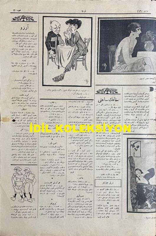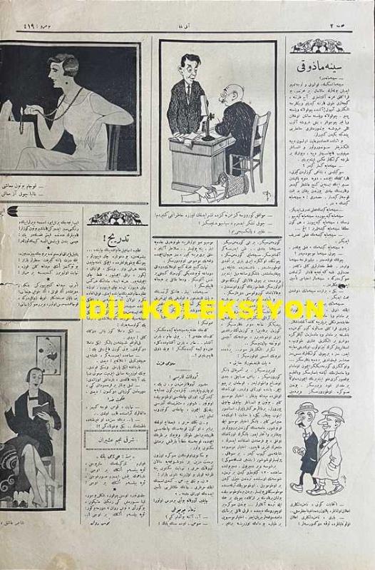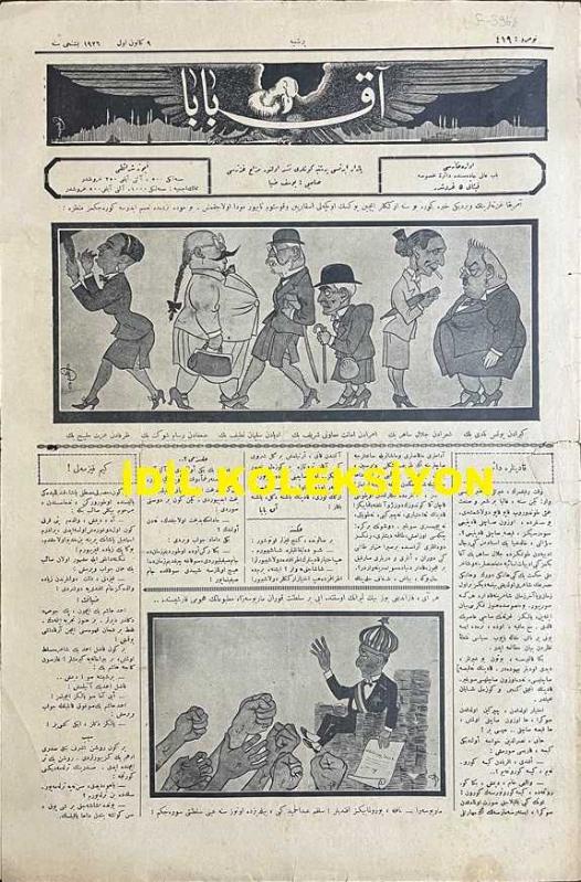 Osmanlıca Akbaba Mizah Dergisi-Gazetesi, Orijinal Dönem Basım, (Ottoman Magazine-Newspaper) - 9 Aralık (Kanun-i Evvel) 1926 - Sayı: 419 - Karikatürist Ramiz Gökçe'nin Çalışması: Amerika Gazetelerinin Verdiği Habere Göre Bu Sene Erkekler İçin Yüksek Ökçeli İskarpin ve Kostüm Tayyör Moda Olacakmış. Bu Moda Bizde de Taammüm Ederse Göreceğimiz Manzara: Küberadan Yunus Nadi Bey, Şuaradan Celal Sahir Bey, Ümeradan Emanet Muavini Şerif Bey, Üdebadan Süleyman Nazif Bey, Zürefadan İzzet Melih Bey - Karikatürist Ramiz Gökçe'nin Çalışması: Her Ay, Kazandığı Yüz Bin Liranın Üstünde Saltanat Kuran Maryosera, Matbuatın Hücumu Karşısında... "Maryosera: Nafile, Yorulmayınız Efendiler! Selefim Abdülhamit Gibi, Yıldız'da Otuz Sene Aynı Saltanatı Süreceğim!" - Kadınlara Dair - "Sinema Zevki" Selami İzzet (Sedes) - "İpek" Necdet Rüştü (Efe) - "Hanımın Saati" Karga - Akbaba'nın Tefrikası: "Gün Doğmayınca" Muharriri: Ercüment Ekrem (Talu) adlı eser, Kitap > Süreli Yayınlar > Gazeteler > Türkiye > Genel kategorisinde İkinci El olarak satıştadır.