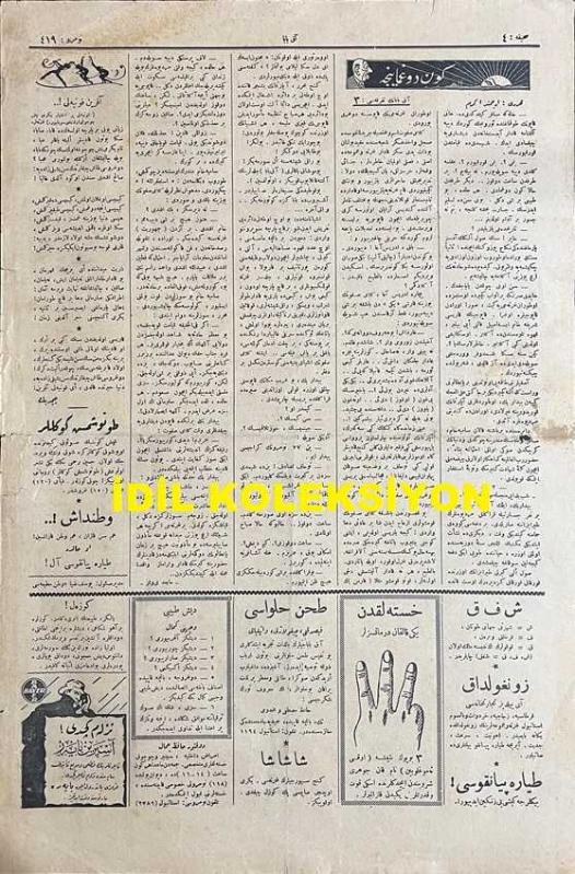 Osmanlıca Akbaba Mizah Dergisi-Gazetesi, Orijinal Dönem Basım, (Ottoman Magazine-Newspaper) - 9 Aralık (Kanun-i Evvel) 1926 - Sayı: 419 - Karikatürist Ramiz Gökçe'nin Çalışması: Amerika Gazetelerinin Verdiği Habere Göre Bu Sene Erkekler İçin Yüksek Ökçeli İskarpin ve Kostüm Tayyör Moda Olacakmış. Bu Moda Bizde de Taammüm Ederse Göreceğimiz Manzara: Küberadan Yunus Nadi Bey, Şuaradan Celal Sahir Bey, Ümeradan Emanet Muavini Şerif Bey, Üdebadan Süleyman Nazif Bey, Zürefadan İzzet Melih Bey - Karikatürist Ramiz Gökçe'nin Çalışması: Her Ay, Kazandığı Yüz Bin Liranın Üstünde Saltanat Kuran Maryosera, Matbuatın Hücumu Karşısında... "Maryosera: Nafile, Yorulmayınız Efendiler! Selefim Abdülhamit Gibi, Yıldız'da Otuz Sene Aynı Saltanatı Süreceğim!" - Kadınlara Dair - "Sinema Zevki" Selami İzzet (Sedes) - "İpek" Necdet Rüştü (Efe) - "Hanımın Saati" Karga - Akbaba'nın Tefrikası: "Gün Doğmayınca" Muharriri: Ercüment Ekrem (Talu), Yusuf Ziya (ORTAÇ) tarafından kaleme alınmıştır. Kitap 1926 yılında [İstanbul] yayınlanmıştır. Satışta olan kitap, yayınevinin 419. baskısıdır. 4 sayfadır. Osmanlıca Akbaba Mizah Dergisi-Gazetesi, Orijinal Dönem Basım, (Ottoman Magazine-Newspaper) - 9 Aralık (Kanun-i Evvel) 1926 - Sayı: 419 - Karikatürist Ramiz Gökçe'nin Çalışması: Amerika Gazetelerinin Verdiği Habere Göre Bu Sene Erkekler İçin Yüksek Ökçeli İskarpin ve Kostüm Tayyör Moda Olacakmış. Bu Moda Bizde de Taammüm Ederse Göreceğimiz Manzara: Küberadan Yunus Nadi Bey, Şuaradan Celal Sahir Bey, Ümeradan Emanet Muavini Şerif Bey, Üdebadan Süleyman Nazif Bey, Zürefadan İzzet Melih Bey - Karikatürist Ramiz Gökçe'nin Çalışması: Her Ay, Kazandığı Yüz Bin Liranın Üstünde Saltanat Kuran Maryosera, Matbuatın Hücumu Karşısında... "Maryosera: Nafile, Yorulmayınız Efendiler! Selefim Abdülhamit Gibi, Yıldız'da Otuz Sene Aynı Saltanatı Süreceğim!" - Kadınlara Dair - "Sinema Zevki" Selami İzzet (Sedes) - "İpek" Necdet Rüştü (Efe) - "Hanımın Saati" Karga - Akbaba'nın Tefrikası: "Gün Doğmayınca" Muharriri: Ercüment Ekrem (Talu) adlı eser Osmanlıca dilindedir.
