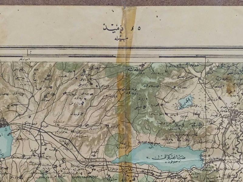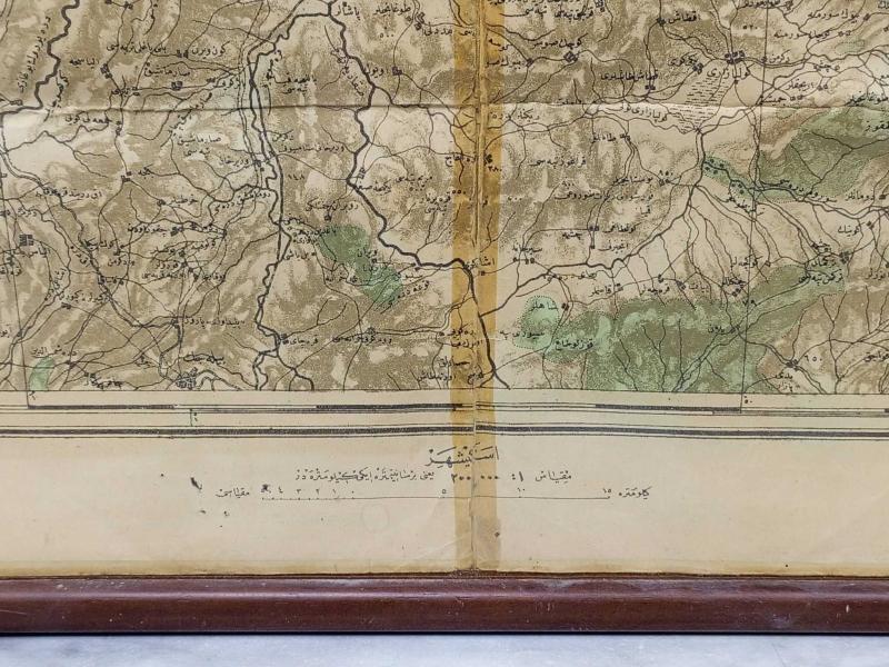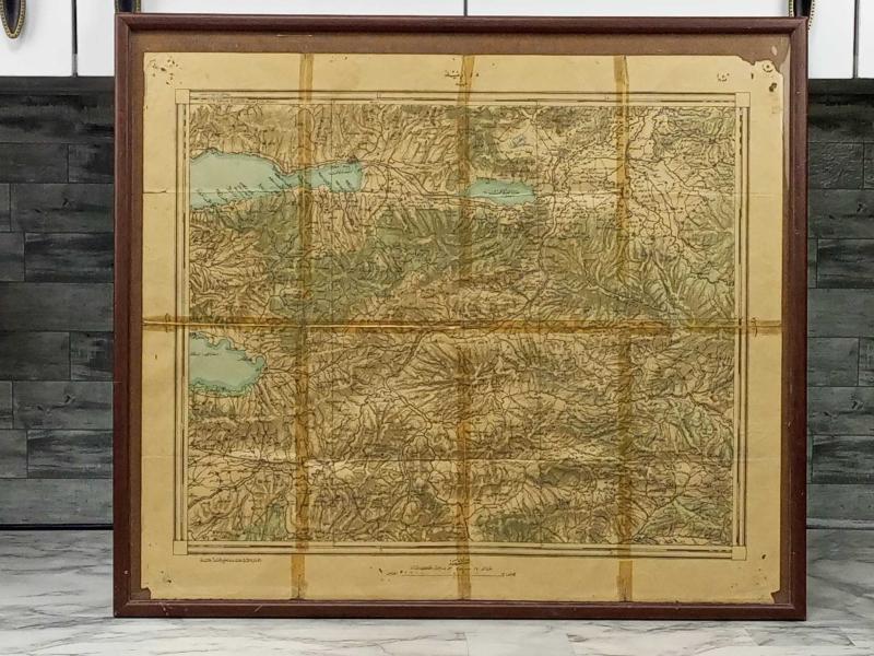 📌 Ürün Açıklaması Tarih: Hicri 1326 (Miladi 1908/1910) Bölge: İzmit (Kocaeli), Sapanca ve Eskişehir hattını kapsayan stratejik bölge. Hazırlayan/Baskı: Erkan-ı Harbiye-i Umumiye Matbaası (Dönemin Genelkurmay Başkanlığı Baskısı). Ölçüler: 63.2 cm x 55 cm (Çerçeveli ölçü). Ölçek: 1:200.000 Açıklama: Bu eser, Osmanlı İmparatorluğu'nun son döneminde askeri amaçlarla hazırlanmış, yüksek detaylı bir bölge haritasıdır. Harita üzerinde "İzmit Paftası" ve "Eskişehir" ibareleri açıkça görülmektedir. Özellikle Sapanca Gölü (Sabancı Gölü) ve çevresindeki köylerin, yolların ve yerleşim yerlerinin o dönemki isimleri Eski Türkçe (Osmanlıca) ile detaylandırılmıştır. Öne Çıkan Özellikler: Orijinal Baskı: Alt köşede "Erkan-ı Harbiye-i Umumiye Matbaasında tab olunmuştur 1326" ibaresi yer almaktadır. Kartografik Detay: Denizler mavi, ormanlık/yüksek alanlar yeşil ve kahverengi tonlarıyla renklendirilmiş, topografik detaylar işlenmiştir. Kondisyon: Yaşına bağlı olarak kağıt üzerinde doğal bir sararma ve katlanma izleri mevcuttur. Bu durum haritanın yaşanmışlığını ve antika değerini pekiştirmektedir. Şık ahşap çerçevesi içerisinde korunmaktadır. Tarihi Önem: Demiryolu hatları, limanlar ve stratejik noktalar titizlikle işaretlenmiştir; tarihçiler ve koleksiyonerler için eşsiz bir veri kaynağıdır. Kullanım Alanı: Tarih meraklıları, harita koleksiyonerleri, ofis veya ev dekorasyonunda antika şıklığı arayanlar için ideal bir parçadır. Osmanlı'nın son dönem coğrafi dokusunu duvarda sergilemek isteyenler için kaçırılmayacak bir fırsattır.