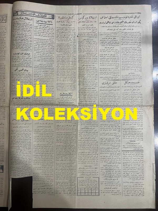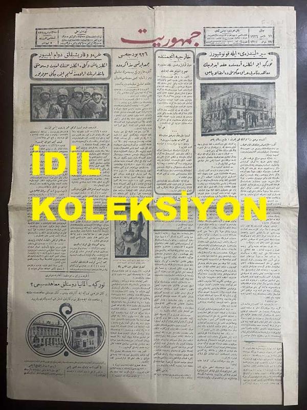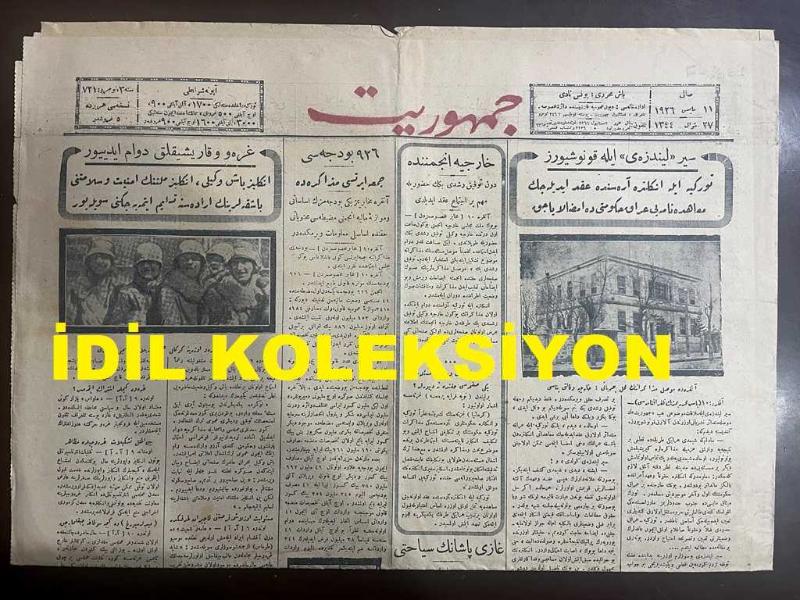 Osmanlıca Cumhuriyet Gazetesi, Orijinal Dönem Basım - 11 Mayıs 1926 - Sayı: 721 - Hicri: 27 Şevval 1344 - Türkiye İle ingiltere Arasında Akdedilecek Muahedenameyi Irak Hükümeti De İmzalayacak - Hariciye Encümeninde Dün Tevfik Rüştü Bey'in Huzuruyla Mühim Bir İctima Akdedildi - Gazi Paşa'nın Seyahati: Dün Mersin'e Muvasalat Buyurdular - 926 Bütçesi Cumartesi Müzakerede - İngiltere'de Grev Ve Karışıklık Devam Ediyor - Ankara -Berlin-Moskova İttihadına Doğru: Türkiye-Almanya Dostluk Muahedesi Mi? - Taksim'de Heykel: Taksim Meydanı Tevsi Edilecek Ve Gazi'nin Muazzam Bir Heykeli Rekz Olunacak - Halk Şarkıları: Halk Şarkılarını Toplamak Ve Nağmeleri Tesbit Etmek İçin Anadolu'ya Heyet Gidecek - İki Yeni Tayyaremiz: İzmir'de İki Tayyaremize İsim Konma Merasiminde Parlak Tezahürat - Kimler Mübadildir? 1912'den Sonra İstanbul'a Gelenlerin Hepsi Mübadil Değil Mi? - Evrak-ı Nakdiye Komisyonunun Dünkü İctimaı: Bir, Beş Ve On Liralık Evrak-ı Nakdiyede Gazi Paşa'nın Resimleri Bulunacaktır, Yunus Nadi (ABALIOĞLU) tarafından kaleme alınmıştır. Kitap 1926 [Hicri: 1344] yılında [İstanbul] yayınlanmıştır. Satışta olan kitap, yayınevinin 721. baskısıdır. 6 sayfadır. Osmanlıca Cumhuriyet Gazetesi, Orijinal Dönem Basım - 11 Mayıs 1926 - Sayı: 721 - Hicri: 27 Şevval 1344 - Türkiye İle ingiltere Arasında Akdedilecek Muahedenameyi Irak Hükümeti De İmzalayacak - Hariciye Encümeninde Dün Tevfik Rüştü Bey'in Huzuruyla Mühim Bir İctima Akdedildi - Gazi Paşa'nın Seyahati: Dün Mersin'e Muvasalat Buyurdular - 926 Bütçesi Cumartesi Müzakerede - İngiltere'de Grev Ve Karışıklık Devam Ediyor - Ankara -Berlin-Moskova İttihadına Doğru: Türkiye-Almanya Dostluk Muahedesi Mi? - Taksim'de Heykel: Taksim Meydanı Tevsi Edilecek Ve Gazi'nin Muazzam Bir Heykeli Rekz Olunacak - Halk Şarkıları: Halk Şarkılarını Toplamak Ve Nağmeleri Tesbit Etmek İçin Anadolu'ya Heyet Gidecek - İki Yeni Tayyaremiz: İzmir'de İki Tayyaremize İsim Konma Merasiminde Parlak Tezahürat - Kimler Mübadildir? 1912'den Sonra İstanbul'a Gelenlerin Hepsi Mübadil Değil Mi? - Evrak-ı Nakdiye Komisyonunun Dünkü İctimaı: Bir, Beş Ve On Liralık Evrak-ı Nakdiyede Gazi Paşa'nın Resimleri Bulunacaktır adlı eser Osmanlıca dilindedir.