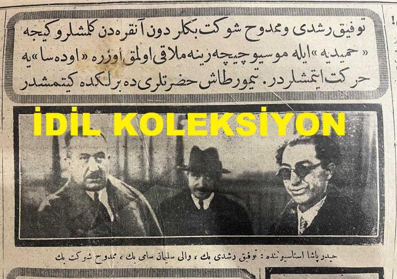 Osmanlıca Cumhuriyet Gazetesi, Orijinal Dönem Basım, (Ottoman Newspaper) - 11 Kasım (Teşrin-i Sani) 1926 - Sayı: 901 - Hicri: 5 Cemaziyelevvel 1345 - Tevfik Rüştü ve Memduh Şevket Beyler Dün Ankara'dan Gelmişler ve Gece Hamidiye İle Mösyö Çiçerin'e Mülaki Olmak Üzere Odesa'ya Hareket Etmişlerdir. Timurtaş Hazretleri de Birlikte Gitmiştir (Foto) Haydar Paşa İstasyonunda: Tevfik Rüştü Bey, Vali Süleyman Sami Bey, Memduh Şevket Bey - Odesa'da Türk-Rus-İran Muahedesinin İmzalanması Muhtemeldir - Ticaret Vekili Mustafa Rahmi Bey Mühim Bir Beyanatta Bulundu: Kömür Buhranı Suret-i Kat'iyede İzale Edildi - Açıkta Kalan Talebe Nihayet Muradlarına Erdiler. Dün Darülfünun'a Davet Edilen Halkalı Ziraat ve Orman Mekteb-i Alilerinin Duhul İmtihanlarını Kazanan Efendilere Mekteplere Kabul Edilecekleri Resmen Tebliğ Edilmiştir - Fatih Camii İçinde Azıtmış Bir Deli. Kasap Bıçağıyla Herkese Saldıran Adam Mecruhen Yakalandı - Moskova Sefaretimizde Cumhuriyet Bayramı Gecesi, Yunus Nadi (ABALIOĞLU) tarafından kaleme alınmıştır. Kitap 1926 [Hicri: 1345] yılında [İstanbul] yayınlanmıştır. Satışta olan kitap, yayınevinin 901. baskısıdır. 6 sayfadır. Osmanlıca Cumhuriyet Gazetesi, Orijinal Dönem Basım, (Ottoman Newspaper) - 11 Kasım (Teşrin-i Sani) 1926 - Sayı: 901 - Hicri: 5 Cemaziyelevvel 1345 - Tevfik Rüştü ve Memduh Şevket Beyler Dün Ankara'dan Gelmişler ve Gece Hamidiye İle Mösyö Çiçerin'e Mülaki Olmak Üzere Odesa'ya Hareket Etmişlerdir. Timurtaş Hazretleri de Birlikte Gitmiştir (Foto) Haydar Paşa İstasyonunda: Tevfik Rüştü Bey, Vali Süleyman Sami Bey, Memduh Şevket Bey - Odesa'da Türk-Rus-İran Muahedesinin İmzalanması Muhtemeldir - Ticaret Vekili Mustafa Rahmi Bey Mühim Bir Beyanatta Bulundu: Kömür Buhranı Suret-i Kat'iyede İzale Edildi - Açıkta Kalan Talebe Nihayet Muradlarına Erdiler. Dün Darülfünun'a Davet Edilen Halkalı Ziraat ve Orman Mekteb-i Alilerinin Duhul İmtihanlarını Kazanan Efendilere Mekteplere Kabul Edilecekleri Resmen Tebliğ Edilmiştir - Fatih Camii İçinde Azıtmış Bir Deli. Kasap Bıçağıyla Herkese Saldıran Adam Mecruhen Yakalandı - Moskova Sefaretimizde Cumhuriyet Bayramı Gecesi adlı eser Osmanlıca dilindedir.