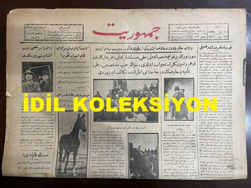 Osmanlıca Cumhuriyet Gazetesi, Orijinal Dönem Basım, (Ottoman Newspaper) - 14 Şubat 1928 - Sayı: 1355 - Hicri: 22 Şaban 1346 - Divan-ı Ali Yavuz ve Havuz İşindeki İrtikabın Muhakemesine Dün de Devam Etti. Dün Nurettin Koniçe, Sapancalı Hakkı, Müsteşar Necati, Bahriye Erkanından Ethem ve Emin Beyler İsticvap Edildi, Sualler Hep Mütehassıs, Tarz-ı Tediye ve Havuzun Derece-i Metaneti Etrafında Tekasüf Ediyordu - Bursa'daki Mislerin Muhakemesine Başlandı. Muhakeme Meraklı Olmuş, Salon Sami'ini Alamamıştır. Şehadetlerine Müracaat Edilen Talebe, Mektepte Dini Propaganda Yapıldığını Müttefiken İfade Etmişlerdir (Foto) Muhakemelerine Başlanan Bursa Amerikan Kolejlerindeki Üç Muallime - (Foto) Mösyö Dumerg'in Hediyesi: Fransa Reis-i Cumhuru Tarafından Gazi Mustafa Kemal Hazretlerine Hediye Edilen Al At - Yedi Katlı Meşhur Hev Merrick Vapuru Limanımızda Demirledi. Vapur Değil Adeta Sabih Bir Adadır. İçinde Salonları, Matbaası, Tenis Mahalleri, Hatta Deniz Hamamları Vardır adlı eser, Kitap > Süreli Yayınlar > Gazeteler > Türkiye > Genel kategorisinde İkinci El olarak satıştadır.