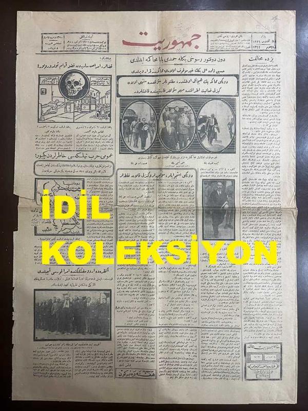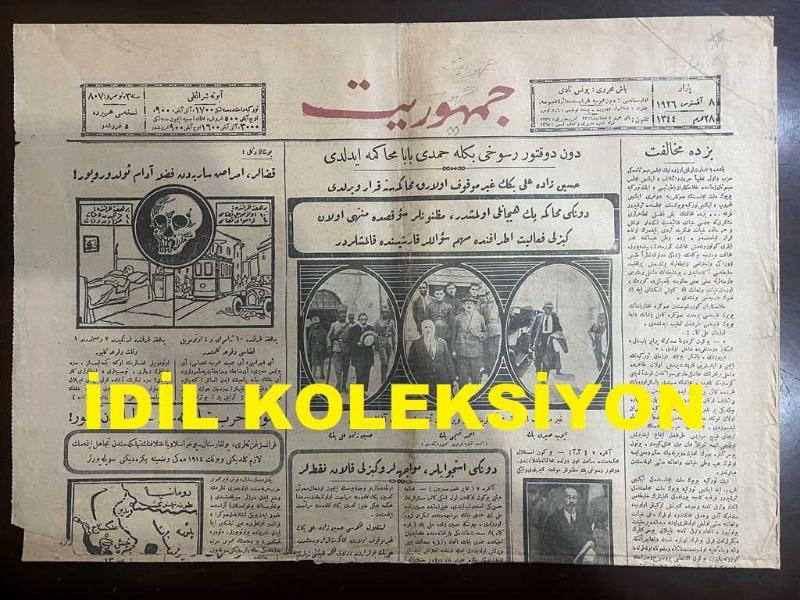 Osmanlıca Cumhuriyet Gazetesi, Orijinal Dönem Basım, (Ottoman Newspaper) - 8 Ağustos 1926 - Sayı: 807 - Hicri: 28 Muharrem 1344 - Dün Doktor Rusuhi Bey'le Hamdi Baba Muhakeme Edildi. Hüseyin-zade Ali Bey'in Gayr-i Mevkuf Olarak Muhakemesine Karar Verildi. Dünkü Muhakeme Pek Heyecanlı Olmuştur, Maznunlar Suikasta Müntehi Olan Gizli Faaliyet Etrafında Mühim Sualler Karşısında Kalmışlardır. (Foto) Gayr-ı Mevkuf Olarak Muhakemelerine Karar Verilenlerin Tahliyeden Sonra Alınan Resimleri: Eyüp Sabri Bey, Ahmet Nesimi Bey, Hüseyin-zade Ali Bey - Dünkü İsticvaplar, Muvaceheler ve Gizli Kalan Noktalar - Bu Şaka Değil: Kazalar, Emraz-ı Sariyeden Fazla Adam Öldürüyor - Umumi Harp Tehlikesi Hatırlardan Geçiyor: Fransız Gazeteleri, Bulgaristan-Yugoslavya İhtilafının Tehlikesinden Tecahül Etmek Lazım Geldiğini ve Bunun 1914'teki Vaziyete Benzediğini Söylüyorlar - Ankara'da Ordu Müfettişliğinde Ümera Kursu Açıldı, Yunus Nadi (ABALIOĞLU) tarafından kaleme alınmıştır. Kitap 1926 [Hicri: 1344] yılında [İstanbul] yayınlanmıştır. Satışta olan kitap, yayınevinin 807. baskısıdır. 4 sayfadır. Osmanlıca Cumhuriyet Gazetesi, Orijinal Dönem Basım, (Ottoman Newspaper) - 8 Ağustos 1926 - Sayı: 807 - Hicri: 28 Muharrem 1344 - Dün Doktor Rusuhi Bey'le Hamdi Baba Muhakeme Edildi. Hüseyin-zade Ali Bey'in Gayr-i Mevkuf Olarak Muhakemesine Karar Verildi. Dünkü Muhakeme Pek Heyecanlı Olmuştur, Maznunlar Suikasta Müntehi Olan Gizli Faaliyet Etrafında Mühim Sualler Karşısında Kalmışlardır. (Foto) Gayr-ı Mevkuf Olarak Muhakemelerine Karar Verilenlerin Tahliyeden Sonra Alınan Resimleri: Eyüp Sabri Bey, Ahmet Nesimi Bey, Hüseyin-zade Ali Bey - Dünkü İsticvaplar, Muvaceheler ve Gizli Kalan Noktalar - Bu Şaka Değil: Kazalar, Emraz-ı Sariyeden Fazla Adam Öldürüyor - Umumi Harp Tehlikesi Hatırlardan Geçiyor: Fransız Gazeteleri, Bulgaristan-Yugoslavya İhtilafının Tehlikesinden Tecahül Etmek Lazım Geldiğini ve Bunun 1914'teki Vaziyete Benzediğini Söylüyorlar - Ankara'da Ordu Müfettişliğinde Ümera Kursu Açıldı adlı eser Osmanlıca dilindedir.