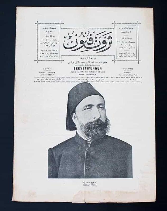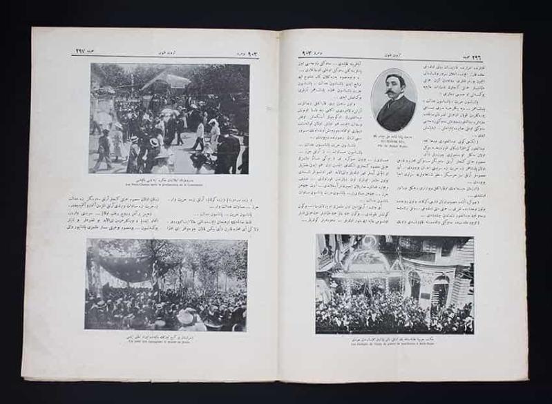 Osmanlıca Süreli Yayın Servet-i Fünun Dergisi İçindekiler: 2. Meşrutiyet ilanı ve haberleri içermektedir Çocuklarımıza Tayin-i Meslek Bismark'ın Şakaları (Hikaye) 25 Ağustos 1908 tarihinde çıkmıştır Sayı:903 16 sayfa Kondisyon: Çok iyi. 25,5x35,5 cm ebatlarında Ön kapakta ; Kapak : Merhum Mithad Paşa fotoğraf kapaklıdır İkinci Fotoğraf- Sol kısımda ki - Yüce Kapı - Bab- ı Ali'de toplananlar topluluk fotoğraflıdır İkinci Fotoğraf - Sağ kısımda ki Fuad Paşa için hazırlanan tören ve muhteşem kalabalık fotoğraflıdır Üçüncü Fotoğraf Birincisi - Meşrutiyet İlanından sonra Tepebaşı Bahçesi Üçüncü Fotoğraf İkincisi - Ahrardan bir genç Türk'ün bahçede irade nutuk etmesi Üçüncü fotoğraf sol alt kısımda olan fotoğraf - Mekteb-i Harbiye talebesinin Beyoğlu Balık Pazarı kilisesinden avdeti topluluk fotoğrafı