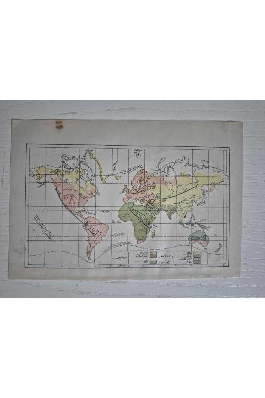 Osmanlıca Dünya Haritası 15x22cm.; Orijinal dönemine ait Osmanlı dönem cihan haritası.; Temiz durumda nadir kitap çıkması.