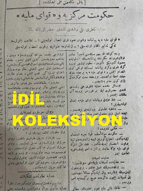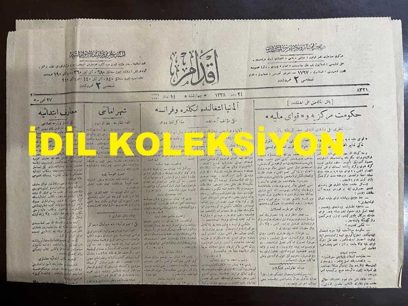 Osmanlıca İkdam Gazetesi, Orijinal Dönem Basım - 14 Nisan 1920 - Sayı: 8321 - Hicri: 24 Recep 1338 - Rumi: 14 Nisan 1336 - Hükümet-i Merkeziye Ve Kuvay-ı Milliye - Adliye Nazırı Ali Rüştü Efendi Hazretlerinin Beyanatı - İtaat Etmezlerse Ne Gibi Tedabir İttihaz Olunacak? - Divan-ı Harplerde Tadilat - İzmir'in Atisi Yeniden Müzakere Edilecek - San Remo Konferansı 19 Nisan'da Küşad Edilecek Ve Fransa, Türkiye Müzakeratına İştirak Edecektir, Mevad-ı Askeriye El'an Muallaktadır - Cemiyet-i Akvam'ın Son İctimaında: Ermenistan Ve Ekalliyetler Meselesi - Bolşeviklerle Sulh: Lehlerle Tatil-i Muhasama Müzakeratı - Prens Sabahattin Bey'e Kabineye Katılması Teklifinin Asılsızlığı - Almanya İşgalinde İngiltere Ve Fransa - Macaristan'da Komünist Harekatı - Anadolu'ya Tebligat İcrası Hakkında Evkaf Nazırının Beyanatı - İstanbul'a Avdet Eden Üsera