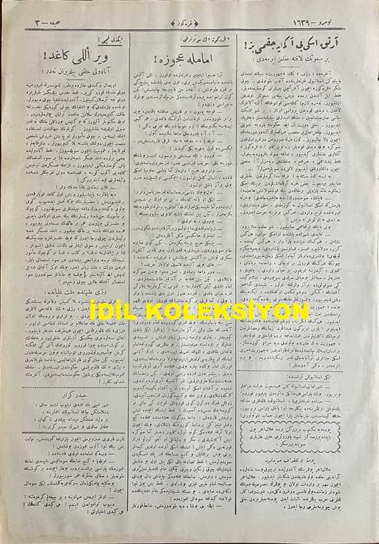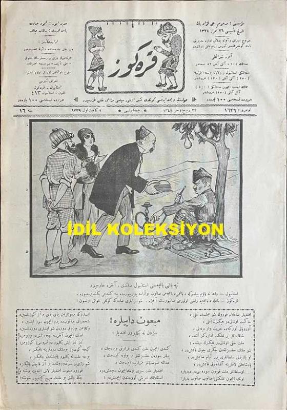 Osmanlıca Karagöz Mizah Dergisi-Gazetesi, Orijinal Dönem Basım, (Ottoman Magazine-Newspaper-Journal Illustré Cara-Gueuz) - 1 Aralık 1923 - Sayı: 1639 - Hicri: 22 Rebiülahir 1342 - Rumi: 1 Kanun-i Evvel 1339 - Karikatür: Tepebaşı Bahçesi'ni İstanbul Sattı. Ankara Harcıyor "İstanbul: Daha Ne Yapayım Bilmem ki, Bahçemi Satıp Bu Adama Yediriyorum da Yine Kendimi Beğendiremiyorum. Karagöz: Bağla, Bahçeye Razı Olur mu Sanıyorsun A Kızım. Şu Sarayları Sat ki Gönlü Hoş Olsun!" - Mebus Dayılara! Sizden Ne Bekliyoruz Efendiler? "Efendiler Sağlam Kurun Şu Mecliste Temeli, Hakimiyet Olmalıdır Hepinizin Emeli (...) - Atatürk ve İsmet İnönü'yü Tasvir Eden Karikatür: Rejinin Kırk Yıllık Hesabı "Karagöz: İşte Mebus Efendiler, Reji Belasının Kırk Yıllık Hesabı Meydanda: Hükümetin Hissesi Üç Beş Mangır, Halkın Hissesi Bir Yığın Ceset, Kendi Hissesi de Bin Çıkın Altın! Artık Bu Belayı Başımızda İster Bırakın İster Kaldırın!", Burhan Cahit (MORKAYA) tarafından kaleme alınmıştır. Kitap 1923 yılında Ali Fuat ve Şürekası Karagöz Gazetesi Şirketi tarafından [İstanbul] yayınlanmıştır. Satışta olan kitap, yayınevinin 1.639. baskısıdır. 4 sayfadır. Osmanlıca Karagöz Mizah Dergisi-Gazetesi, Orijinal Dönem Basım, (Ottoman Magazine-Newspaper-Journal Illustré Cara-Gueuz) - 1 Aralık 1923 - Sayı: 1639 - Hicri: 22 Rebiülahir 1342 - Rumi: 1 Kanun-i Evvel 1339 - Karikatür: Tepebaşı Bahçesi'ni İstanbul Sattı. Ankara Harcıyor "İstanbul: Daha Ne Yapayım Bilmem ki, Bahçemi Satıp Bu Adama Yediriyorum da Yine Kendimi Beğendiremiyorum. Karagöz: Bağla, Bahçeye Razı Olur mu Sanıyorsun A Kızım. Şu Sarayları Sat ki Gönlü Hoş Olsun!" - Mebus Dayılara! Sizden Ne Bekliyoruz Efendiler? "Efendiler Sağlam Kurun Şu Mecliste Temeli, Hakimiyet Olmalıdır Hepinizin Emeli (...) - Atatürk ve İsmet İnönü'yü Tasvir Eden Karikatür: Rejinin Kırk Yıllık Hesabı "Karagöz: İşte Mebus Efendiler, Reji Belasının Kırk Yıllık Hesabı Meydanda: Hükümetin Hissesi Üç Beş Mangır, Halkın Hissesi Bir Yığın Ceset, Kendi Hissesi de Bin Çıkın Altın! Artık Bu Belayı Başımızda İster Bırakın İster Kaldırın!" adlı eser Osmanlıca dilindedir.