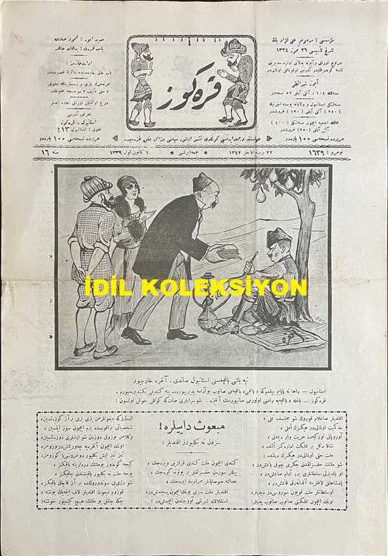 Osmanlıca Karagöz Mizah Dergisi-Gazetesi, Orijinal Dönem Basım, (Ottoman Magazine-Newspaper-Journal Illustré Cara-Gueuz) - 1 Aralık 1923 - Sayı: 1639 - Hicri: 22 Rebiülahir 1342 - Rumi: 1 Kanun-i Evvel 1339 - Karikatür: Tepebaşı Bahçesi'ni İstanbul Sattı. Ankara Harcıyor "İstanbul: Daha Ne Yapayım Bilmem ki, Bahçemi Satıp Bu Adama Yediriyorum da Yine Kendimi Beğendiremiyorum. Karagöz: Bağla, Bahçeye Razı Olur mu Sanıyorsun A Kızım. Şu Sarayları Sat ki Gönlü Hoş Olsun!" - Mebus Dayılara! Sizden Ne Bekliyoruz Efendiler? "Efendiler Sağlam Kurun Şu Mecliste Temeli, Hakimiyet Olmalıdır Hepinizin Emeli (...) - Atatürk ve İsmet İnönü'yü Tasvir Eden Karikatür: Rejinin Kırk Yıllık Hesabı "Karagöz: İşte Mebus Efendiler, Reji Belasının Kırk Yıllık Hesabı Meydanda: Hükümetin Hissesi Üç Beş Mangır, Halkın Hissesi Bir Yığın Ceset, Kendi Hissesi de Bin Çıkın Altın! Artık Bu Belayı Başımızda İster Bırakın İster Kaldırın!", Burhan Cahit (MORKAYA) tarafından kaleme alınmıştır. Kitap 1923 yılında Ali Fuat ve Şürekası Karagöz Gazetesi Şirketi tarafından [İstanbul] yayınlanmıştır. Satışta olan kitap, yayınevinin 1.639. baskısıdır. 4 sayfadır. Osmanlıca Karagöz Mizah Dergisi-Gazetesi, Orijinal Dönem Basım, (Ottoman Magazine-Newspaper-Journal Illustré Cara-Gueuz) - 1 Aralık 1923 - Sayı: 1639 - Hicri: 22 Rebiülahir 1342 - Rumi: 1 Kanun-i Evvel 1339 - Karikatür: Tepebaşı Bahçesi'ni İstanbul Sattı. Ankara Harcıyor "İstanbul: Daha Ne Yapayım Bilmem ki, Bahçemi Satıp Bu Adama Yediriyorum da Yine Kendimi Beğendiremiyorum. Karagöz: Bağla, Bahçeye Razı Olur mu Sanıyorsun A Kızım. Şu Sarayları Sat ki Gönlü Hoş Olsun!" - Mebus Dayılara! Sizden Ne Bekliyoruz Efendiler? "Efendiler Sağlam Kurun Şu Mecliste Temeli, Hakimiyet Olmalıdır Hepinizin Emeli (...) - Atatürk ve İsmet İnönü'yü Tasvir Eden Karikatür: Rejinin Kırk Yıllık Hesabı "Karagöz: İşte Mebus Efendiler, Reji Belasının Kırk Yıllık Hesabı Meydanda: Hükümetin Hissesi Üç Beş Mangır, Halkın Hissesi Bir Yığın Ceset, Kendi Hissesi de Bin Çıkın Altın! Artık Bu Belayı Başımızda İster Bırakın İster Kaldırın!" adlı eser Osmanlıca dilindedir.