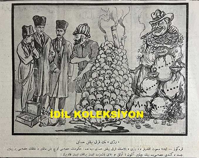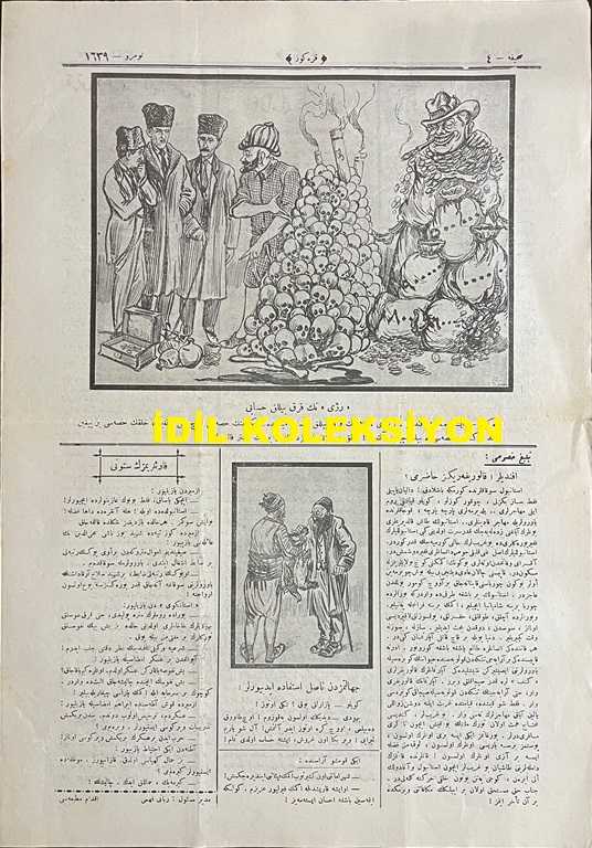 Osmanlıca Karagöz Mizah Dergisi-Gazetesi, Orijinal Dönem Basım, (Ottoman Magazine-Newspaper-Journal Illustré Cara-Gueuz) - 1 Aralık 1923 - Sayı: 1639 - Hicri: 22 Rebiülahir 1342 - Rumi: 1 Kanun-i Evvel 1339 - Karikatür: Tepebaşı Bahçesi'ni İstanbul Sattı. Ankara Harcıyor "İstanbul: Daha Ne Yapayım Bilmem ki, Bahçemi Satıp Bu Adama Yediriyorum da Yine Kendimi Beğendiremiyorum. Karagöz: Bağla, Bahçeye Razı Olur mu Sanıyorsun A Kızım. Şu Sarayları Sat ki Gönlü Hoş Olsun!" - Mebus Dayılara! Sizden Ne Bekliyoruz Efendiler? "Efendiler Sağlam Kurun Şu Mecliste Temeli, Hakimiyet Olmalıdır Hepinizin Emeli (...) - Atatürk ve İsmet İnönü'yü Tasvir Eden Karikatür: Rejinin Kırk Yıllık Hesabı "Karagöz: İşte Mebus Efendiler, Reji Belasının Kırk Yıllık Hesabı Meydanda: Hükümetin Hissesi Üç Beş Mangır, Halkın Hissesi Bir Yığın Ceset, Kendi Hissesi de Bin Çıkın Altın! Artık Bu Belayı Başımızda İster Bırakın İster Kaldırın!" adlı eser, Kitap > Süreli Yayınlar > Gazeteler > Türkiye > Genel kategorisinde İkinci El olarak satıştadır.