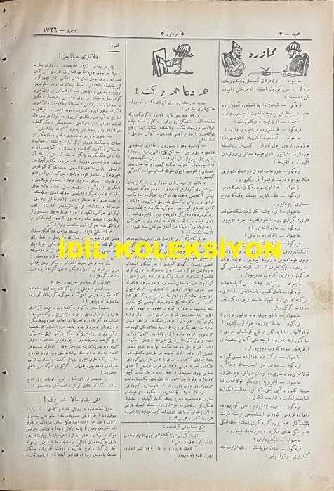 Osmanlıca Karagöz Mizah Dergisi-Gazetesi, Orijinal Dönem Basım, (Ottoman Magazine-Newspaper-Journal Illustré Cara-Gueuz) - 1 Ekim 1924 - Sayı: 1726 - Hicri: 1 Rebiülevvel 1342 - Rumi: 1 Teşrin-i Evvel 1340 - Karikatür: İdaremiz! "Hacivat: Bana Öyle Gelmeye Başladı ki Yine Eski Hamam Eski Tas! Karagöz: Öyle Hacivat, Yalnız Hamamcı ile Natır da Değişti Galiba!" - Karikatür: Bu da Denir mi Acaba? "Ahali: Hey Vekil Bey! Çocuklarımızı Hangi Mektebe Götürdükse Yer Yok Dediler. Bunları Nerede Okutacağız? Maarif Vekili: Acele Etmeyin A Canım, Çocuklarınız Bu Yıl Top, Yarış, Oyunlarıyla Vakit Geçirsinler, Gelecek Sene Allah Kerim!", Burhan Cahit (MORKAYA) tarafından kaleme alınmıştır. Kitap 1924 yılında Ali Fuat ve Şürekası Karagöz Gazetesi Şirketi tarafından [İstanbul] yayınlanmıştır. Satışta olan kitap, yayınevinin 1.726. baskısıdır. 4 sayfadır. Osmanlıca Karagöz Mizah Dergisi-Gazetesi, Orijinal Dönem Basım, (Ottoman Magazine-Newspaper-Journal Illustré Cara-Gueuz) - 1 Ekim 1924 - Sayı: 1726 - Hicri: 1 Rebiülevvel 1342 - Rumi: 1 Teşrin-i Evvel 1340 - Karikatür: İdaremiz! "Hacivat: Bana Öyle Gelmeye Başladı ki Yine Eski Hamam Eski Tas! Karagöz: Öyle Hacivat, Yalnız Hamamcı ile Natır da Değişti Galiba!" - Karikatür: Bu da Denir mi Acaba? "Ahali: Hey Vekil Bey! Çocuklarımızı Hangi Mektebe Götürdükse Yer Yok Dediler. Bunları Nerede Okutacağız? Maarif Vekili: Acele Etmeyin A Canım, Çocuklarınız Bu Yıl Top, Yarış, Oyunlarıyla Vakit Geçirsinler, Gelecek Sene Allah Kerim!" adlı eser Osmanlıca dilindedir.