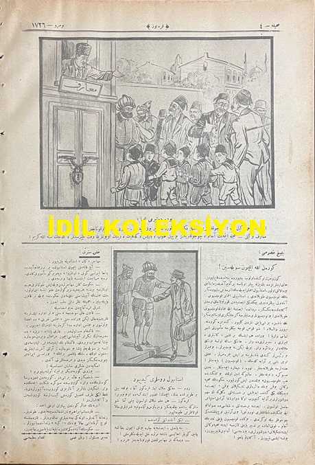 Osmanlıca Karagöz Mizah Dergisi-Gazetesi, Orijinal Dönem Basım, (Ottoman Magazine-Newspaper-Journal Illustré Cara-Gueuz) - 1 Ekim 1924 - Sayı: 1726 - Hicri: 1 Rebiülevvel 1342 - Rumi: 1 Teşrin-i Evvel 1340 - Karikatür: İdaremiz! "Hacivat: Bana Öyle Gelmeye Başladı ki Yine Eski Hamam Eski Tas! Karagöz: Öyle Hacivat, Yalnız Hamamcı ile Natır da Değişti Galiba!" - Karikatür: Bu da Denir mi Acaba? "Ahali: Hey Vekil Bey! Çocuklarımızı Hangi Mektebe Götürdükse Yer Yok Dediler. Bunları Nerede Okutacağız? Maarif Vekili: Acele Etmeyin A Canım, Çocuklarınız Bu Yıl Top, Yarış, Oyunlarıyla Vakit Geçirsinler, Gelecek Sene Allah Kerim!" adlı eser, Kitap > Süreli Yayınlar > Gazeteler > Türkiye > Genel kategorisinde İkinci El olarak satıştadır.