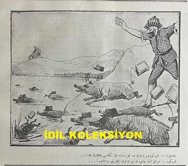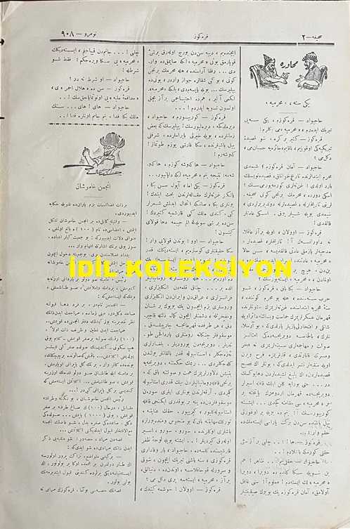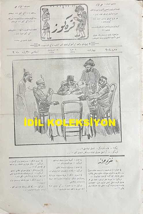 Osmanlıca Karagöz Mizah Dergisi-Gazetesi, Orijinal Dönem Basım, (Ottoman Magazine-Newspaper-Journal Illustré Cara-Gueuz) - 1 Kasım 1916 - Sayı: 908 - Hicri: 3 Muharrem 1335 - Rumi: 19 Teşrin-i Evvel 1332 - Karikatür: "Nikita: Kare Tamam Değil, Nasıl Olacak?... Karagöz: Azıcık Sabırlı Olun Dördüncü Şimdi Gelir?!.." - Romanya Kraliçesinin Rusya İmparatoriçesinden İstimdadı - Karikatür: "Hacivat: Karagözüm Bunların da Kuyruğuna Gaz Tenekesi Bağladın ha?... Karagöz: Merak Etme Hacivat Onların İçlerini Boşalttım!...", Burhan Cahit (MORKAYA) tarafından kaleme alınmıştır. Kitap 1916 yılında Ali Fuat ve Şürekası Karagöz Gazetesi Şirketi tarafından [İstanbul] yayınlanmıştır. Satışta olan kitap, yayınevinin 908. baskısıdır. 4 sayfadır. Osmanlıca Karagöz Mizah Dergisi-Gazetesi, Orijinal Dönem Basım, (Ottoman Magazine-Newspaper-Journal Illustré Cara-Gueuz) - 1 Kasım 1916 - Sayı: 908 - Hicri: 3 Muharrem 1335 - Rumi: 19 Teşrin-i Evvel 1332 - Karikatür: "Nikita: Kare Tamam Değil, Nasıl Olacak?... Karagöz: Azıcık Sabırlı Olun Dördüncü Şimdi Gelir?!.." - Romanya Kraliçesinin Rusya İmparatoriçesinden İstimdadı - Karikatür: "Hacivat: Karagözüm Bunların da Kuyruğuna Gaz Tenekesi Bağladın ha?... Karagöz: Merak Etme Hacivat Onların İçlerini Boşalttım!..." adlı eser Osmanlıca dilindedir.