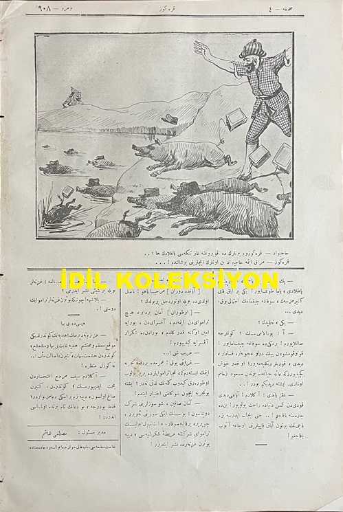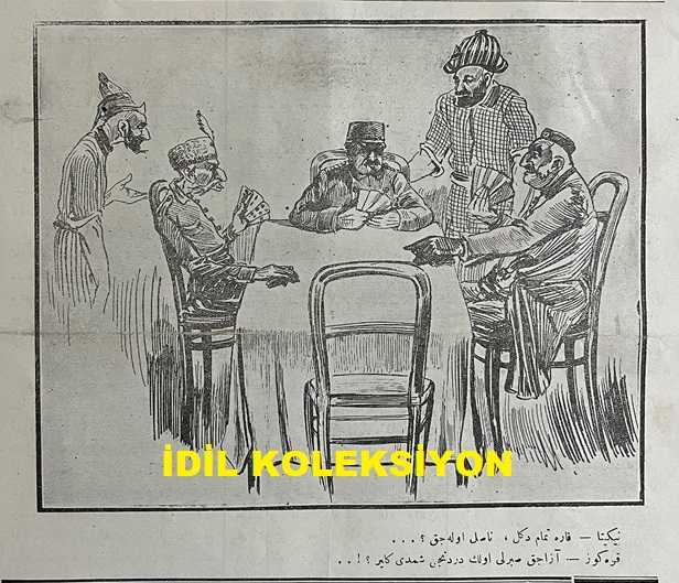 Osmanlıca Karagöz Mizah Dergisi-Gazetesi, Orijinal Dönem Basım, (Ottoman Magazine-Newspaper-Journal Illustré Cara-Gueuz) - 1 Kasım 1916 - Sayı: 908 - Hicri: 3 Muharrem 1335 - Rumi: 19 Teşrin-i Evvel 1332 - Karikatür: "Nikita: Kare Tamam Değil, Nasıl Olacak?... Karagöz: Azıcık Sabırlı Olun Dördüncü Şimdi Gelir?!.." - Romanya Kraliçesinin Rusya İmparatoriçesinden İstimdadı - Karikatür: "Hacivat: Karagözüm Bunların da Kuyruğuna Gaz Tenekesi Bağladın ha?... Karagöz: Merak Etme Hacivat Onların İçlerini Boşalttım!..." adlı eser, Kitap > Süreli Yayınlar > Gazeteler > Türkiye > Genel kategorisinde İkinci El olarak satıştadır.