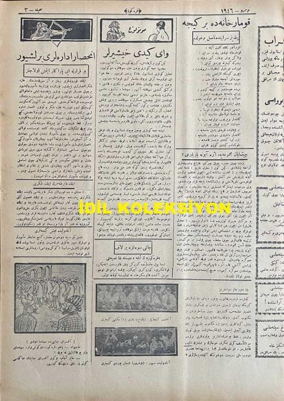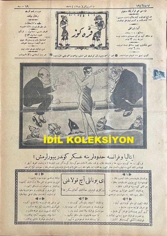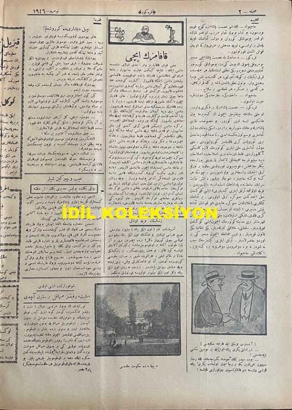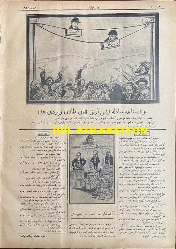 Osmanlıca Karagöz Mizah Dergisi-Gazetesi, Orijinal Dönem Basım, (Ottoman Magazine-Newspaper-Journal Illustré Cara-Gueuz) - 10 Kasım 1926 - Sayı: 1946 - Karikatür: İtalya ve Fransa Hudutlarına Asker Gönderiyorlarmış! "Karagöz: Ha Göreyim Sizi, Ha Bir Kapışın Bakayım. Bu Kadar Hazırlandıktan Sonra Vazgeçseniz Ayıp Olur Ha! Ne Zamandır Şöyle Azılı Bir Kavga Seyretmedikdi, Ne Olur, İnsan Hatır İçin Bile Muharebe Eder Yahu! Hele Bizim Rahmetli Enver Sağ Olsaydı Dostlarının Bir Sözünü İki Etmezdi" - Fotoğraf: Biga'da Hükümet Caddesi - Fotoğraf: Anadolu Gençliği: Yalvaç Gazi Paşa Mektebi Gençleri Fotoğraf: Anadolu'da Spor: Bodrum İdman Yurdu Gençleri - Mübadeleye Dair Karikatür: Yunanistan'la Mübadele İşi Artık Kabak Tadı Verdi "Murahhaslar: Acele Etmeyin, Daha Hevesimizi Almadık. Birkaç Yüz Kere Daha Gidip Gelelim, Elbet Bu İşi Hallederiz. Karagöz: Acelesi Ne. Üç Yıldır Sizin Peşinizde, Atina ile Ankara Arasında Mekik Dokuyorsunuz, Şu İşe Ya Evet Ya Hayır Deseniz de Millet de İşini Bilse", Burhan Cahit (MORKAYA) tarafından kaleme alınmıştır. Kitap 1926 yılında Ali Fuat ve Şürekası Karagöz Gazetesi Şirketi tarafından [İstanbul] yayınlanmıştır. Satışta olan kitap, yayınevinin 1.946. baskısıdır. 4 sayfadır. Osmanlıca Karagöz Mizah Dergisi-Gazetesi, Orijinal Dönem Basım, (Ottoman Magazine-Newspaper-Journal Illustré Cara-Gueuz) - 10 Kasım 1926 - Sayı: 1946 - Karikatür: İtalya ve Fransa Hudutlarına Asker Gönderiyorlarmış! "Karagöz: Ha Göreyim Sizi, Ha Bir Kapışın Bakayım. Bu Kadar Hazırlandıktan Sonra Vazgeçseniz Ayıp Olur Ha! Ne Zamandır Şöyle Azılı Bir Kavga Seyretmedikdi, Ne Olur, İnsan Hatır İçin Bile Muharebe Eder Yahu! Hele Bizim Rahmetli Enver Sağ Olsaydı Dostlarının Bir Sözünü İki Etmezdi" - Fotoğraf: Biga'da Hükümet Caddesi - Fotoğraf: Anadolu Gençliği: Yalvaç Gazi Paşa Mektebi Gençleri Fotoğraf: Anadolu'da Spor: Bodrum İdman Yurdu Gençleri - Mübadeleye Dair Karikatür: Yunanistan'la Mübadele İşi Artık Kabak Tadı Verdi "Murahhaslar: Acele Etmeyin, Daha Hevesimizi Almadık. Birkaç Yüz Kere Daha Gidip Gelelim, Elbet Bu İşi Hallederiz. Karagöz: Acelesi Ne. Üç Yıldır Sizin Peşinizde, Atina ile Ankara Arasında Mekik Dokuyorsunuz, Şu İşe Ya Evet Ya Hayır Deseniz de Millet de İşini Bilse" adlı eser Osmanlıca dilindedir.
