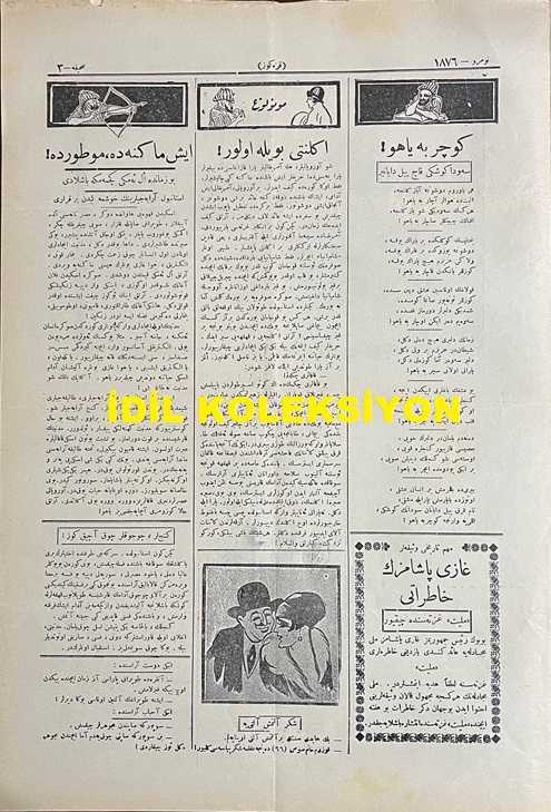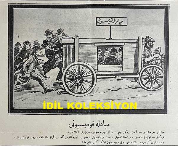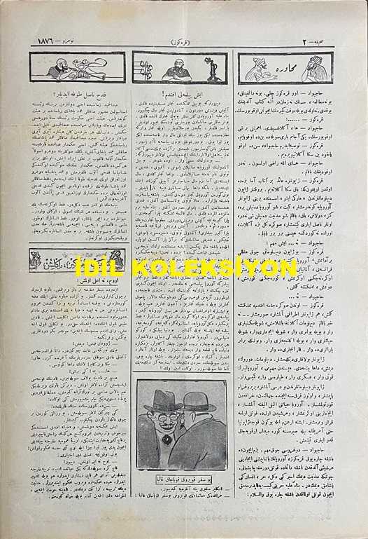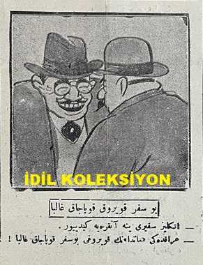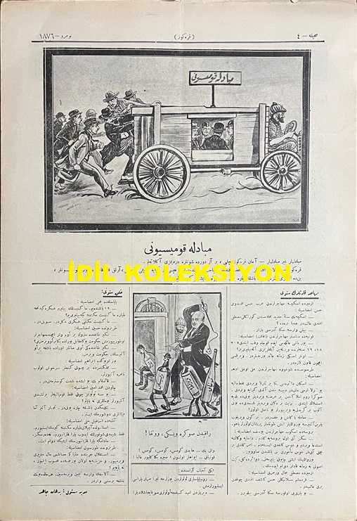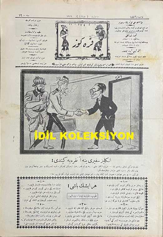 Osmanlıca Karagöz Mizah Dergisi-Gazetesi, Orijinal Dönem Basım, (Ottoman Magazine-Newspaper-Journal Illustré Cara-Gueuz) - 10 Mart 1926 - Sayı: 1876 - Karikatürist Kozma Togo'nun Musul Meselesine Dair Dışişleri Bakanı Tevfik Rüştü Aras'ı Tasvir Eden Çalışması: İngiliz Sefiri Yine Ankara'ya Gitti! "Hariciye Vekili Tevfik Rüştü Bey: Azizim İngiliz Çelebi. Yine Buraya Kadar Zahmet Ettiniz Geldiniz, Ümit Ederim ki Bu Sefer Çantanızdan Bol Bol Laf Değil Ciddi, Kat'i Müjdeler Çıkaracaksınız! Karagöz: Bu Sefer Havadan Sudan Bahsetmek Yok. Şu Musul İşini Halledip Bitirin. Kelim Kızıyor ha!" - Karikatür: Mübadele Komisyonu "Mübadiller Gayr-i Mübadiller: Aman Karagöz Çelebi, Biraz Dur da Şunlara Derdimizi Anlatalım. Karagöz: Olamaz Efendiler, Bu Aza Efendiler Seyahat Merakındalar, Hepsi Bir Araya Geldi mi Gelmedi mi, Artık Kafa Kafaya Verip Konuşsunlar, Ben de Onları Gezdireyim. Başka Çare Yok, Büsbütün İşiniz Geri Kalır ha!", Burhan Cahit (MORKAYA) tarafından kaleme alınmıştır. Kitap 1926 yılında Ali Fuat ve Şürekası Karagöz Gazetesi Şirketi tarafından [İstanbul] yayınlanmıştır. Satışta olan kitap, yayınevinin 1.876. baskısıdır. 4 sayfadır. Osmanlıca Karagöz Mizah Dergisi-Gazetesi, Orijinal Dönem Basım, (Ottoman Magazine-Newspaper-Journal Illustré Cara-Gueuz) - 10 Mart 1926 - Sayı: 1876 - Karikatürist Kozma Togo'nun Musul Meselesine Dair Dışişleri Bakanı Tevfik Rüştü Aras'ı Tasvir Eden Çalışması: İngiliz Sefiri Yine Ankara'ya Gitti! "Hariciye Vekili Tevfik Rüştü Bey: Azizim İngiliz Çelebi. Yine Buraya Kadar Zahmet Ettiniz Geldiniz, Ümit Ederim ki Bu Sefer Çantanızdan Bol Bol Laf Değil Ciddi, Kat'i Müjdeler Çıkaracaksınız! Karagöz: Bu Sefer Havadan Sudan Bahsetmek Yok. Şu Musul İşini Halledip Bitirin. Kelim Kızıyor ha!" - Karikatür: Mübadele Komisyonu "Mübadiller Gayr-i Mübadiller: Aman Karagöz Çelebi, Biraz Dur da Şunlara Derdimizi Anlatalım. Karagöz: Olamaz Efendiler, Bu Aza Efendiler Seyahat Merakındalar, Hepsi Bir Araya Geldi mi Gelmedi mi, Artık Kafa Kafaya Verip Konuşsunlar, Ben de Onları Gezdireyim. Başka Çare Yok, Büsbütün İşiniz Geri Kalır ha!" adlı eser Osmanlıca dilindedir.