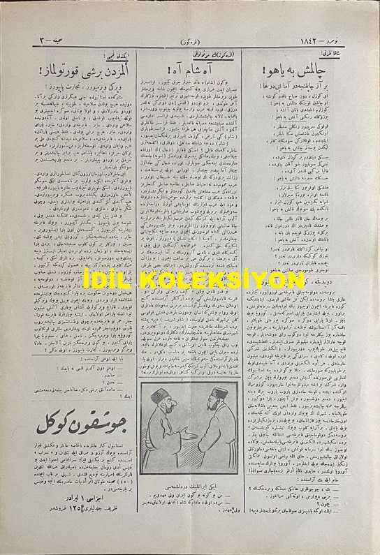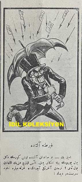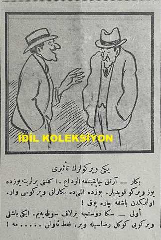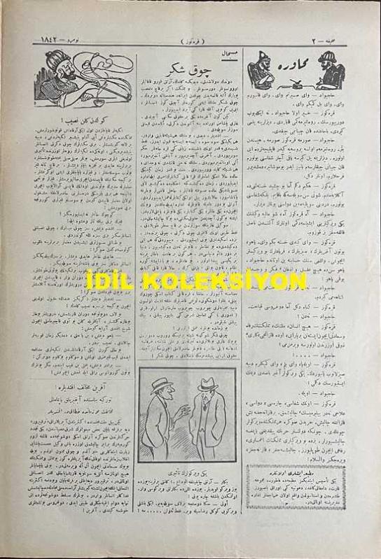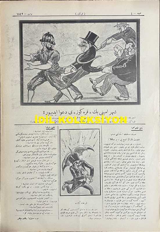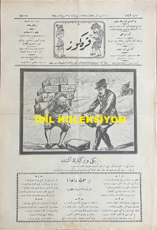 Osmanlıca Karagöz Mizah Dergisi-Gazetesi, Orijinal Dönem Basım, (Ottoman Magazine-Newspaper-Journal Illustré Cara-Gueuz) - 11 Kasım (Teşrin-i Sani) 1925 - Sayı: 1842 - Hicri: 23 Rebiülahir 1344 - Karikatür: Yeni Vergilerin Altında "Maliye Vekili: Nasıl Karagöz Çelebi, O Kadar Ağır mı, Şunu da İlave Edeyim mi? Karagöz: Yok Beyim, Korktuğum Kadar Değil. Fakat Keşke Genç Olsam da O Vergiyi de Seve Seve Versem!" - İstanbul Şehremini Emin Erkul'u Tasvir Eden Karikatür: Şehremini Bey Karagöz'ü Dava Ediyor! "Emin Bey: Bunları Başıma Musallat Eden Hep Sensin, Alimallah Seni Mahkeme Kapılarında, Sürüm Sürüm Süründüreyim de Sen de Gör. Karagöz: Adalet Kapısında Yüzüm Paktır. Orası Şehremaneti Değil Çelebim. Hem Sen Benimle Uğraşacağına Onlara Meram Anlatsana Bakayım!", Burhan Cahit (MORKAYA) tarafından kaleme alınmıştır. Kitap 1925 yılında Ali Fuat ve Şürekası Karagöz Gazetesi Şirketi tarafından [İstanbul] yayınlanmıştır. Satışta olan kitap, yayınevinin 1.842. baskısıdır. 4 sayfadır. Osmanlıca Karagöz Mizah Dergisi-Gazetesi, Orijinal Dönem Basım, (Ottoman Magazine-Newspaper-Journal Illustré Cara-Gueuz) - 11 Kasım (Teşrin-i Sani) 1925 - Sayı: 1842 - Hicri: 23 Rebiülahir 1344 - Karikatür: Yeni Vergilerin Altında "Maliye Vekili: Nasıl Karagöz Çelebi, O Kadar Ağır mı, Şunu da İlave Edeyim mi? Karagöz: Yok Beyim, Korktuğum Kadar Değil. Fakat Keşke Genç Olsam da O Vergiyi de Seve Seve Versem!" - İstanbul Şehremini Emin Erkul'u Tasvir Eden Karikatür: Şehremini Bey Karagöz'ü Dava Ediyor! "Emin Bey: Bunları Başıma Musallat Eden Hep Sensin, Alimallah Seni Mahkeme Kapılarında, Sürüm Sürüm Süründüreyim de Sen de Gör. Karagöz: Adalet Kapısında Yüzüm Paktır. Orası Şehremaneti Değil Çelebim. Hem Sen Benimle Uğraşacağına Onlara Meram Anlatsana Bakayım!" adlı eser Osmanlıca dilindedir.