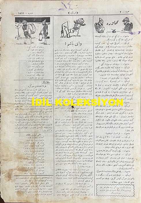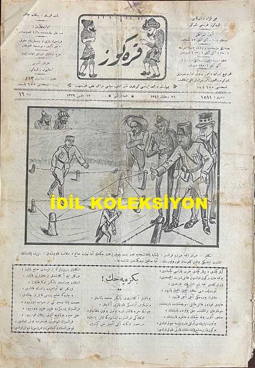 Osmanlıca Karagöz Mizah Dergisi-Gazetesi, Orijinal Dönem Basım, (Ottoman Magazine-Newspaper-Journal Illustré Cara-Gueuz) - 12 Mayıs 1923 - Sayı: 1581 - Hicri: 26 Ramazan 1341 - Rumi: 12 Mayıs 1339 - Lozan Barış Konferansı'na Dair İsmet İnönü'yü Tasvir Eden Karikatür: "İngiliz: merak Etme Azizim Fransız! Paşa'ya Yaklaşıncaya Kadar Biz de Çok Zahmet Çektik Amma Nihayet Sağ, Selamet Kavuştuk! Siz de Paşa'nın İşaret Ettiği Yoldan Gelirsen Kurtulursun! Amma Sakın Dediğinden Şaşma ha!" - Lozan Barış Konferansı'na Dair İsmet İnönü'yü Tasvir Eden Karikatür: Lozan Seferberliği: "Venizelos: Eski Aftosunuzu Gönülden Çıkarmayın Paşam! Elinizi Uzatınız da Barışalım! Karagöz: Ulan Aftos, Ulan Aftos, Dilindeki Ne, Elindeki Ne, Şu Haline Bakmaz Bir de Eline Silah Alyaya Kalkarsın ha! Çok Sokulma Elindekini Alır Beynine Saplarım ha!" - Sultan Vahdettin'i Tasvir Eden Karikatür: Kalbinden Hasta İmiş! "Vahdettin: Kalb-i Viranım Yanıyor Yok Bana Rahm Eyleyecek" Hicazkar Makamından Şarkı, Burhan Cahit (MORKAYA) tarafından kaleme alınmıştır. Kitap 1923 yılında Ali Fuat ve Şürekası Karagöz Gazetesi Şirketi tarafından [İstanbul] yayınlanmıştır. Satışta olan kitap, yayınevinin 1.581. baskısıdır. 4 sayfadır. Osmanlıca Karagöz Mizah Dergisi-Gazetesi, Orijinal Dönem Basım, (Ottoman Magazine-Newspaper-Journal Illustré Cara-Gueuz) - 12 Mayıs 1923 - Sayı: 1581 - Hicri: 26 Ramazan 1341 - Rumi: 12 Mayıs 1339 - Lozan Barış Konferansı'na Dair İsmet İnönü'yü Tasvir Eden Karikatür: "İngiliz: merak Etme Azizim Fransız! Paşa'ya Yaklaşıncaya Kadar Biz de Çok Zahmet Çektik Amma Nihayet Sağ, Selamet Kavuştuk! Siz de Paşa'nın İşaret Ettiği Yoldan Gelirsen Kurtulursun! Amma Sakın Dediğinden Şaşma ha!" - Lozan Barış Konferansı'na Dair İsmet İnönü'yü Tasvir Eden Karikatür: Lozan Seferberliği: "Venizelos: Eski Aftosunuzu Gönülden Çıkarmayın Paşam! Elinizi Uzatınız da Barışalım! Karagöz: Ulan Aftos, Ulan Aftos, Dilindeki Ne, Elindeki Ne, Şu Haline Bakmaz Bir de Eline Silah Alyaya Kalkarsın ha! Çok Sokulma Elindekini Alır Beynine Saplarım ha!" - Sultan Vahdettin'i Tasvir Eden Karikatür: Kalbinden Hasta İmiş! "Vahdettin: Kalb-i Viranım Yanıyor Yok Bana Rahm Eyleyecek" Hicazkar Makamından Şarkı adlı eser Osmanlıca dilindedir.