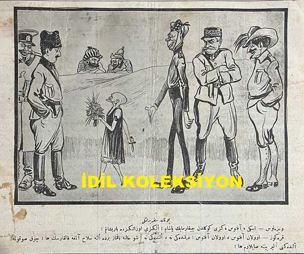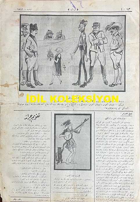 Osmanlıca Karagöz Mizah Dergisi-Gazetesi, Orijinal Dönem Basım, (Ottoman Magazine-Newspaper-Journal Illustré Cara-Gueuz) - 12 Mayıs 1923 - Sayı: 1581 - Hicri: 26 Ramazan 1341 - Rumi: 12 Mayıs 1339 - Lozan Barış Konferansı'na Dair İsmet İnönü'yü Tasvir Eden Karikatür: "İngiliz: merak Etme Azizim Fransız! Paşa'ya Yaklaşıncaya Kadar Biz de Çok Zahmet Çektik Amma Nihayet Sağ, Selamet Kavuştuk! Siz de Paşa'nın İşaret Ettiği Yoldan Gelirsen Kurtulursun! Amma Sakın Dediğinden Şaşma ha!" - Lozan Barış Konferansı'na Dair İsmet İnönü'yü Tasvir Eden Karikatür: Lozan Seferberliği: "Venizelos: Eski Aftosunuzu Gönülden Çıkarmayın Paşam! Elinizi Uzatınız da Barışalım! Karagöz: Ulan Aftos, Ulan Aftos, Dilindeki Ne, Elindeki Ne, Şu Haline Bakmaz Bir de Eline Silah Alyaya Kalkarsın ha! Çok Sokulma Elindekini Alır Beynine Saplarım ha!" - Sultan Vahdettin'i Tasvir Eden Karikatür: Kalbinden Hasta İmiş! "Vahdettin: Kalb-i Viranım Yanıyor Yok Bana Rahm Eyleyecek" Hicazkar Makamından Şarkı adlı eser, Kitap > Süreli Yayınlar > Gazeteler > Türkiye > Genel kategorisinde İkinci El olarak satıştadır.