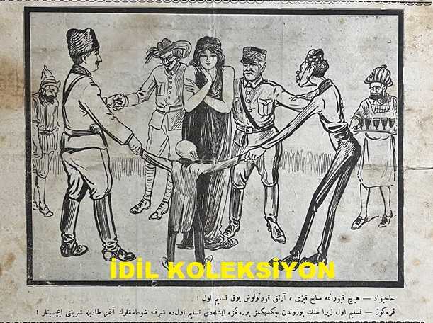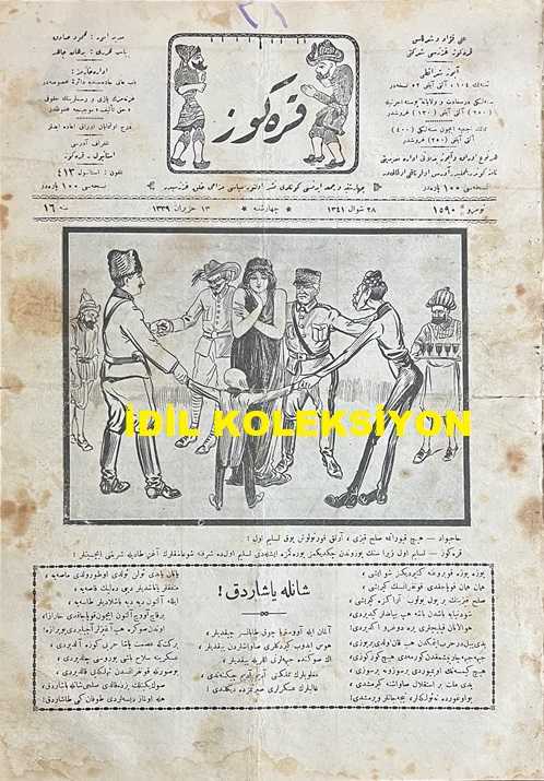 Osmanlıca Karagöz Mizah Dergisi-Gazetesi, Orijinal Dönem Basım, (Ottoman Magazine-Newspaper-Journal Illustré Cara-Gueuz) - 13 Haziran 1923 - Sayı: 1590 - Hicri: 28 Şevval 1341 - Rumi: 13 Haziran 1339 - Lozan Barış Konferansı'na Dair İsmet İnönü'yü Tasvir Eden Karikatür: "Hacivat: Hiç Kıvranma Sulh Kızı, Artık Kurtuluş Yok Teslim Ol! Karagöz: Teslim Ol Zira Senin Yüzünden Çektiğimiz Yüreğimize İşledi Teslim Ol da Şerefine Şu Aşıkların Ağız Tadıyla Şerbetini İçsinler!" - Serkenkebin Divanı: "Kadıköy Güzeli" Şair-i Meşhur Serkenkebin (Aka Gündüz) Her Nüsha Bir Semtin Güzelini Parmağına Dolayacaktır! - Lozan Barış Konferansı'na Dair İsmet İnönü'yü Tasvir Eden Karikatür: "Fransız: Haberiniz Olsun! Birini Bırakıp İkisini Alıyorum! Karagöz: Yağma Yok Çelebi Hakkına Razı Ol Ya Altını Bırakır Sulhu Alırsın, Yahut Üçünü Birden Almaya Razı Olursun!"