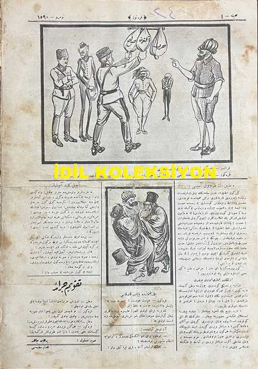 Osmanlıca Karagöz Mizah Dergisi-Gazetesi, Orijinal Dönem Basım, (Ottoman Magazine-Newspaper-Journal Illustré Cara-Gueuz) - 13 Haziran 1923 - Sayı: 1590 - Hicri: 28 Şevval 1341 - Rumi: 13 Haziran 1339 - Lozan Barış Konferansı'na Dair İsmet İnönü'yü Tasvir Eden Karikatür: "Hacivat: Hiç Kıvranma Sulh Kızı, Artık Kurtuluş Yok Teslim Ol! Karagöz: Teslim Ol Zira Senin Yüzünden Çektiğimiz Yüreğimize İşledi Teslim Ol da Şerefine Şu Aşıkların Ağız Tadıyla Şerbetini İçsinler!" - Serkenkebin Divanı: "Kadıköy Güzeli" Şair-i Meşhur Serkenkebin (Aka Gündüz) Her Nüsha Bir Semtin Güzelini Parmağına Dolayacaktır! - Lozan Barış Konferansı'na Dair İsmet İnönü'yü Tasvir Eden Karikatür: "Fransız: Haberiniz Olsun! Birini Bırakıp İkisini Alıyorum! Karagöz: Yağma Yok Çelebi Hakkına Razı Ol Ya Altını Bırakır Sulhu Alırsın, Yahut Üçünü Birden Almaya Razı Olursun!" adlı eser, Kitap > Süreli Yayınlar > Gazeteler > Türkiye > Genel kategorisinde İkinci El olarak satıştadır.