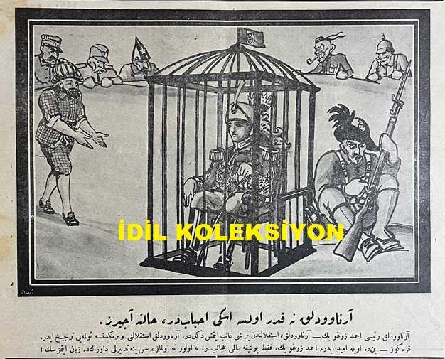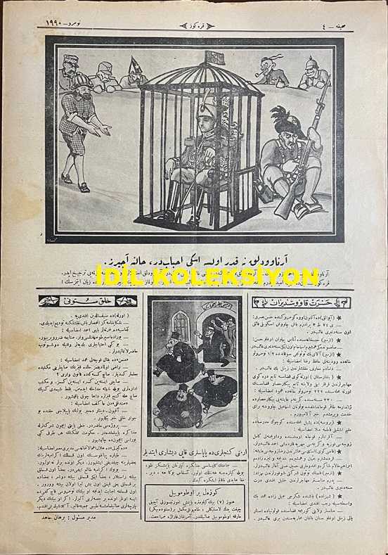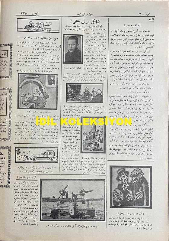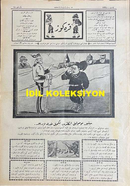 Osmanlıca Karagöz Mizah Dergisi-Gazetesi, Orijinal Dönem Basım, (Ottoman Magazine-Newspaper-Journal Illustré Cara-Gueuz) - 13 Nisan 1927 - Sayı: 1990 - Karikatürist Kozma Togo'nun Benito Mussolini'yi Tasvir Eden Çalışması: Sinyor Mussolini İngiltere'ye Tekmil Haberi Veriyor. "Sinyor Mussolini: Emirleriniz İfa Edildi, Sırbistan Çember İçine Alındı, Rumen, Macar İttifakı Temin Edildi. Fransa'ya Katakulli Oynandı, Arnavutluk Avuç İçine Alındı. Vaziyetimiz Mükemmel, Hesabımız Tekmil, Başka Vukuatımız Yoktur Kumandanım! Karagöz: Oh, Ala, Mükemmel, İşler Yolunda, Yalnız Silah Patlamadan Verilmiş Tekmil Haberlerine İnanmak Caiz Değildir. Bu Vaziyete Bakıp da Kuvvetli Olduğunuza İnanmayın Ha!" - Fotoğraf: Bir Haftadan Beri İzmir'in Adını Taşıyan Kuvvetli Deniz Tayyaremiz - Fotoğraf: İzmir'deki Kahraman Tayyare Zabitlerimizden Bir Kısmı - Karikatür: Arnavutluk Ne Kadar Olsa Eski Ahbaptır, Haline Acırız - Karikatür: Ermeni Gençleri de Papazları Kapı Dışarı Ettiler, Burhan Cahit (MORKAYA) tarafından kaleme alınmıştır. Kitap 1927 yılında Ali Fuat ve Şürekası Karagöz Gazetesi Şirketi tarafından [İstanbul] yayınlanmıştır. Satışta olan kitap, yayınevinin 1.990. baskısıdır. 4 sayfadır. Osmanlıca Karagöz Mizah Dergisi-Gazetesi, Orijinal Dönem Basım, (Ottoman Magazine-Newspaper-Journal Illustré Cara-Gueuz) - 13 Nisan 1927 - Sayı: 1990 - Karikatürist Kozma Togo'nun Benito Mussolini'yi Tasvir Eden Çalışması: Sinyor Mussolini İngiltere'ye Tekmil Haberi Veriyor. "Sinyor Mussolini: Emirleriniz İfa Edildi, Sırbistan Çember İçine Alındı, Rumen, Macar İttifakı Temin Edildi. Fransa'ya Katakulli Oynandı, Arnavutluk Avuç İçine Alındı. Vaziyetimiz Mükemmel, Hesabımız Tekmil, Başka Vukuatımız Yoktur Kumandanım! Karagöz: Oh, Ala, Mükemmel, İşler Yolunda, Yalnız Silah Patlamadan Verilmiş Tekmil Haberlerine İnanmak Caiz Değildir. Bu Vaziyete Bakıp da Kuvvetli Olduğunuza İnanmayın Ha!" - Fotoğraf: Bir Haftadan Beri İzmir'in Adını Taşıyan Kuvvetli Deniz Tayyaremiz - Fotoğraf: İzmir'deki Kahraman Tayyare Zabitlerimizden Bir Kısmı - Karikatür: Arnavutluk Ne Kadar Olsa Eski Ahbaptır, Haline Acırız - Karikatür: Ermeni Gençleri de Papazları Kapı Dışarı Ettiler adlı eser Osmanlıca dilindedir.