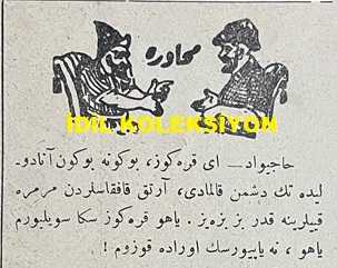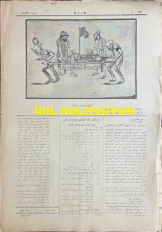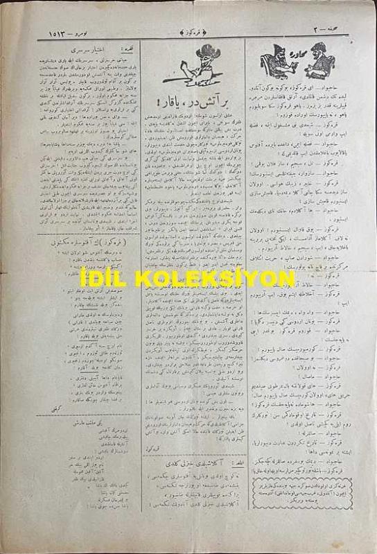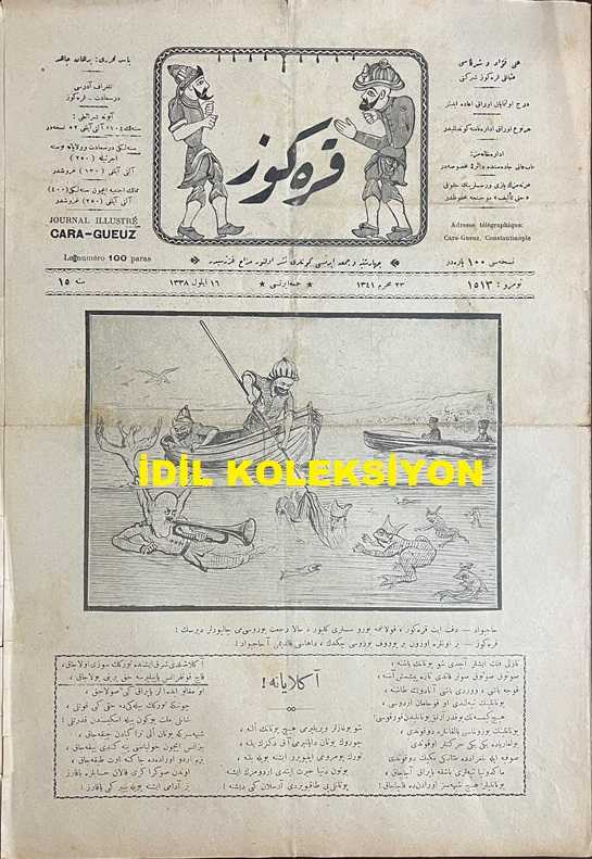 Osmanlıca Karagöz Mizah Dergisi-Gazetesi, Orijinal Dönem Basım, (Ottoman Magazine-Newspaper-Journal Illustré Cara-Gueuz) - 16 Eylül 1922 - Sayı: 1513 - Hicri: 23 Muharrem 1341 - Rumi: 16 Eylül 1338 - Karikatür: "Hacivat: Dikkat Et Karagöz, Kulağıma Boru Sesleri Geliyor, Hala Ricat Borusu mu Çalıyorlar Dersin! Karagöz: Biz Onlara Uzun Bir Yuf Borusu Çektik, Dahası Kaldı mı A Hacivat!" - Karagöz'ün Aftoslara Mektubu - Amcamın Köşesi: "Zamanın İstihzası!" Ahmet Rasim - Bozgun Sonu "Anadolu Yunanın Sade Ordusunu Değil Hükümetini de Bozdu" - Karikatür: Köpeği Öldürene Sürütürler "Hacivat: Diri Getirdiler, Ölü Götürüyorlar. Karagöz: Bilmez misin Hacivat Meşhur Sözdür İti Öldürene Sürütürler!", Burhan Cahit (MORKAYA) tarafından kaleme alınmıştır. Kitap 1922 yılında Ali Fuat ve Şürekası Karagöz Gazetesi Şirketi tarafından [İstanbul] yayınlanmıştır. Satışta olan kitap, yayınevinin 1.513. baskısıdır. 4 sayfadır. Osmanlıca Karagöz Mizah Dergisi-Gazetesi, Orijinal Dönem Basım, (Ottoman Magazine-Newspaper-Journal Illustré Cara-Gueuz) - 16 Eylül 1922 - Sayı: 1513 - Hicri: 23 Muharrem 1341 - Rumi: 16 Eylül 1338 - Karikatür: "Hacivat: Dikkat Et Karagöz, Kulağıma Boru Sesleri Geliyor, Hala Ricat Borusu mu Çalıyorlar Dersin! Karagöz: Biz Onlara Uzun Bir Yuf Borusu Çektik, Dahası Kaldı mı A Hacivat!" - Karagöz'ün Aftoslara Mektubu - Amcamın Köşesi: "Zamanın İstihzası!" Ahmet Rasim - Bozgun Sonu "Anadolu Yunanın Sade Ordusunu Değil Hükümetini de Bozdu" - Karikatür: Köpeği Öldürene Sürütürler "Hacivat: Diri Getirdiler, Ölü Götürüyorlar. Karagöz: Bilmez misin Hacivat Meşhur Sözdür İti Öldürene Sürütürler!" adlı eser Osmanlıca dilindedir.