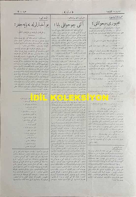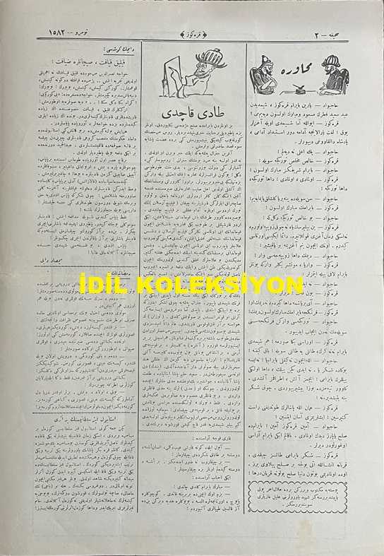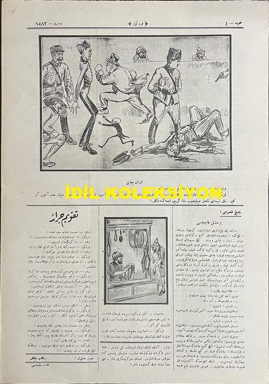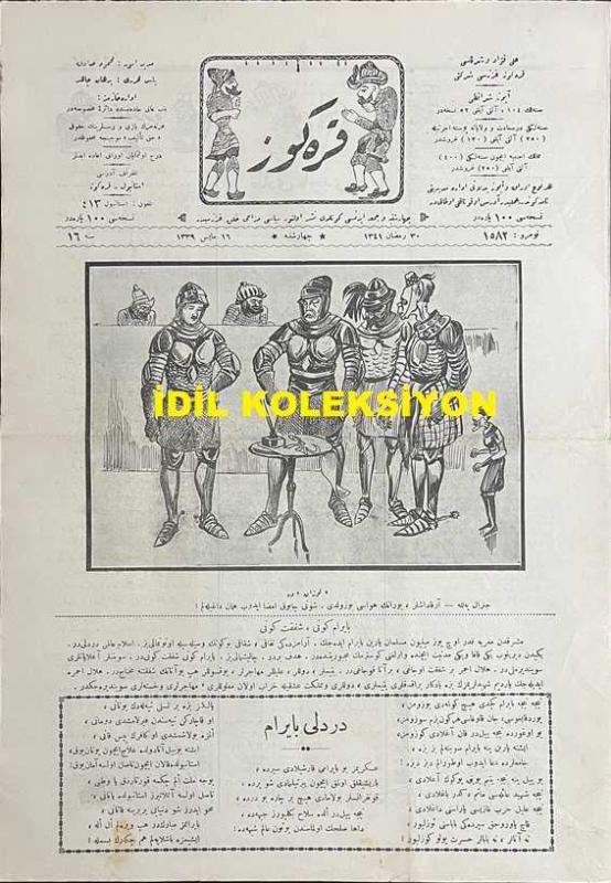 Osmanlıca Karagöz Mizah Dergisi-Gazetesi, Orijinal Dönem Basım, (Ottoman Magazine-Newspaper-Journal Illustré Cara-Gueuz) - 16 Mayıs 1923 - Sayı: 1582 - Hicri: 30 Ramazan 1341 - Rumi: 16 Mayıs 1339 - Lozan Barış Konferansına Dair Karikatür: Lozan'da "Ceneral Pelle: Arkadaşlar, Buranın Havası Bozuldu. Şunu Çabuk İmza Edip Hemen Dağılalım!" - Nice Nice Bayram Geçti Hiç Gülmedi Yüzümüz, Yurt Kaygusu, Can Kavgası Her Gün Bizim Sözümüz, Bu Uğurda Nice Yıldır Kan Ağladı Gözümüz, İşte Yarın Yine Bayram Sevinelim Biz Bize (...) - Lozan Barış Konferansına Dair İsmet İnönü'yü Tasvir Eden Karikatür: Karikatür: Lozan Cinayeti "Venizelos: Burada Cinayet Var Dayıcığım, Ben Duramam! Karagöz: Sen Durmazsın da Dayın Durur mu! Onlardan Birinin Kılına Bin Kitap Kapitülasyon, Milyon Dönüm Arazi, Milyar Adet Altın Az Gelir. Bak Şimdi Nasıl Sıkışıp Müzakereyi Kısa Kesecekler!", Burhan Cahit (MORKAYA) tarafından kaleme alınmıştır. Kitap 1923 yılında Ali Fuat ve Şürekası Karagöz Gazetesi Şirketi tarafından [İstanbul] yayınlanmıştır. Satışta olan kitap, yayınevinin 1.582. baskısıdır. 4 sayfadır. Osmanlıca Karagöz Mizah Dergisi-Gazetesi, Orijinal Dönem Basım, (Ottoman Magazine-Newspaper-Journal Illustré Cara-Gueuz) - 16 Mayıs 1923 - Sayı: 1582 - Hicri: 30 Ramazan 1341 - Rumi: 16 Mayıs 1339 - Lozan Barış Konferansına Dair Karikatür: Lozan'da "Ceneral Pelle: Arkadaşlar, Buranın Havası Bozuldu. Şunu Çabuk İmza Edip Hemen Dağılalım!" - Nice Nice Bayram Geçti Hiç Gülmedi Yüzümüz, Yurt Kaygusu, Can Kavgası Her Gün Bizim Sözümüz, Bu Uğurda Nice Yıldır Kan Ağladı Gözümüz, İşte Yarın Yine Bayram Sevinelim Biz Bize (...) - Lozan Barış Konferansına Dair İsmet İnönü'yü Tasvir Eden Karikatür: Karikatür: Lozan Cinayeti "Venizelos: Burada Cinayet Var Dayıcığım, Ben Duramam! Karagöz: Sen Durmazsın da Dayın Durur mu! Onlardan Birinin Kılına Bin Kitap Kapitülasyon, Milyon Dönüm Arazi, Milyar Adet Altın Az Gelir. Bak Şimdi Nasıl Sıkışıp Müzakereyi Kısa Kesecekler!" adlı eser Osmanlıca dilindedir.