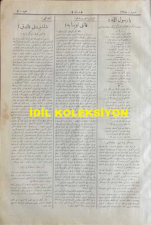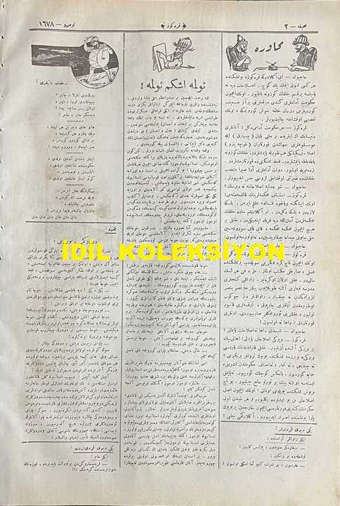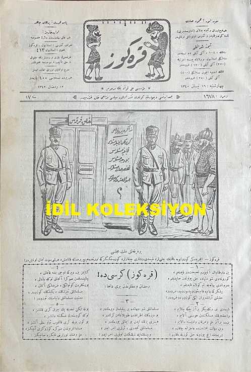 Osmanlıca Karagöz Mizah Dergisi-Gazetesi, Orijinal Dönem Basım, (Ottoman Magazine-Newspaper-Journal Illustré Cara-Gueuz) - 16 Nisan 1924 - Sayı: 1678 - Hicri: 12 Ramazan 1340 - Rumi: 16 Nisan 1340 - Karikatür: Bir Fırkalık Millet Meclisi "Karagöz: İçerideki Gürültüye Bakmayın Çelebiler, Şimdi Dışarı Çıkarlar, Göreceksiniz ki Ortada Hiçbir Mesele Kalmamış, Her Şey Süt Liman Olmuştur!" - Karikatür: Oruç Yemek Meselesi "Hacivat: İnsaf be Polis Efendi, Baksana Şu Camekandan İçeri! Herifler Rakısıyla, Mezesiyle Ense yapıyor, Siz Burada Adamcağızı Bir Cigara İçiyor Diye Enseliyorsunuz! Karagöz: Kabahati Var Hacivat, Lazımsa O da Zengin Olsaydı!!", Burhan Cahit (MORKAYA) tarafından kaleme alınmıştır. Kitap 1924 yılında Ali Fuat ve Şürekası Karagöz Gazetesi Şirketi tarafından [İstanbul] yayınlanmıştır. Satışta olan kitap, yayınevinin 1.678. baskısıdır. 4 sayfadır. Osmanlıca Karagöz Mizah Dergisi-Gazetesi, Orijinal Dönem Basım, (Ottoman Magazine-Newspaper-Journal Illustré Cara-Gueuz) - 16 Nisan 1924 - Sayı: 1678 - Hicri: 12 Ramazan 1340 - Rumi: 16 Nisan 1340 - Karikatür: Bir Fırkalık Millet Meclisi "Karagöz: İçerideki Gürültüye Bakmayın Çelebiler, Şimdi Dışarı Çıkarlar, Göreceksiniz ki Ortada Hiçbir Mesele Kalmamış, Her Şey Süt Liman Olmuştur!" - Karikatür: Oruç Yemek Meselesi "Hacivat: İnsaf be Polis Efendi, Baksana Şu Camekandan İçeri! Herifler Rakısıyla, Mezesiyle Ense yapıyor, Siz Burada Adamcağızı Bir Cigara İçiyor Diye Enseliyorsunuz! Karagöz: Kabahati Var Hacivat, Lazımsa O da Zengin Olsaydı!!" adlı eser Osmanlıca dilindedir.