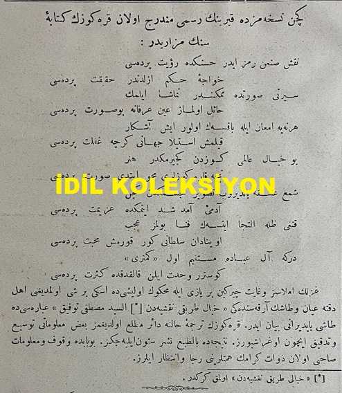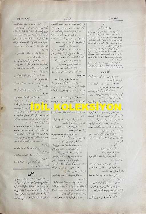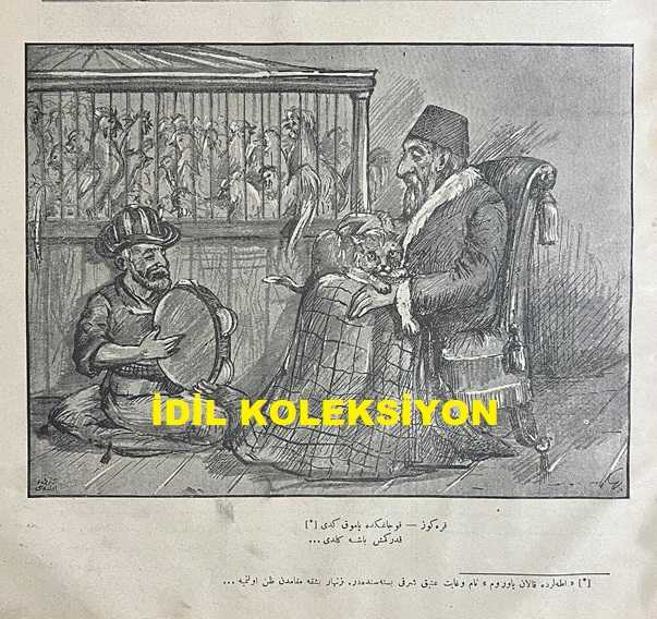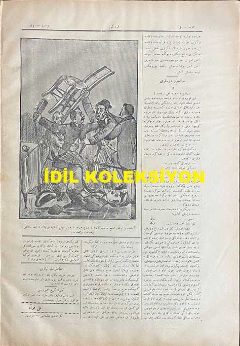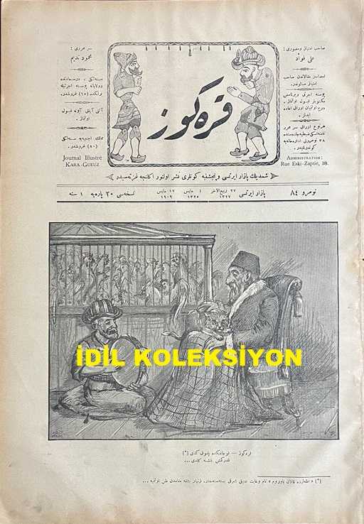 Osmanlıca Karagöz Mizah Dergisi-Gazetesi, Orijinal Dönem Basım, (Ottoman Magazine-Newspaper-Journal Illustré Cara-Gueuz) - 17 Mayıs 1909 - Sayı: 84 - Hicri: 27 Rebiülahir 1327 - Rumi: 4 Mayıs 1325 - II. Abdülhamit'in Hal Edilmesine Dair Karikatür: "Karagöz: Kucağında Pamuk Kedi, Kaderinmiş Başa Geldi... ('Adalar'da Kalan Yavrum' Nam ve Gayet Atik Şarkı Bestesindendir. Zinhar Başka Makamdan Zan Olunmaya...) - Geçen Nüshamızda Kabrinin Resmi Münderiç Olan Karagöz'ün Kitabe-i Seng-i Mezarıdır" - Karikatür: Atina'da Bir Otelde Müctemi Sahib-i Kemal (!) Birkaç Mürteci Tarafından Mevki-i Temaşaya Konulan 'İt Dalaşı' Piyesinden Bir Sahne..." adlı eser, Kitap > Süreli Yayınlar > Gazeteler > Türkiye > Genel kategorisinde İkinci El olarak satıştadır.