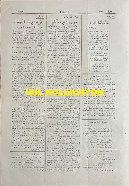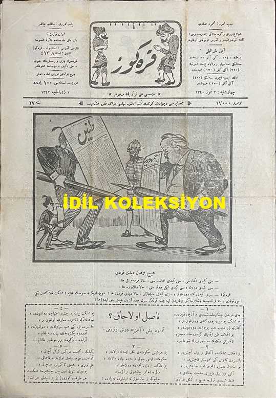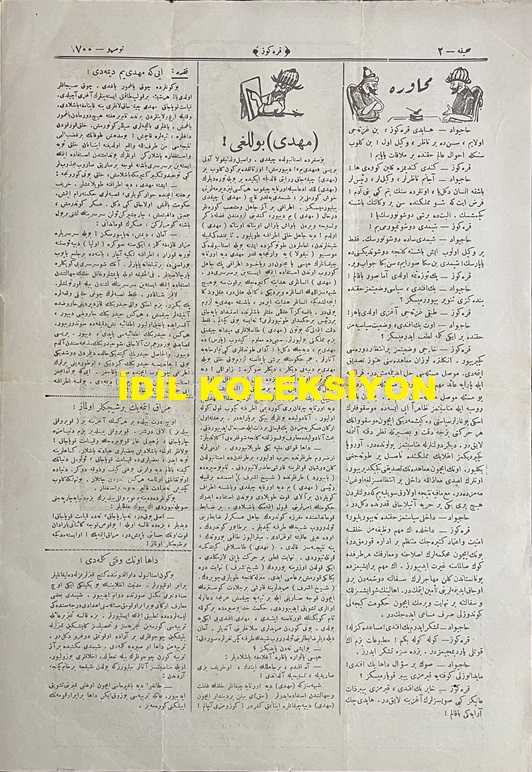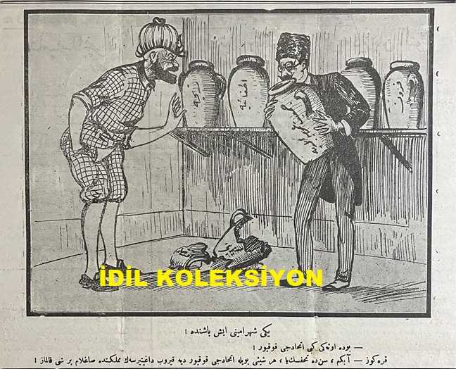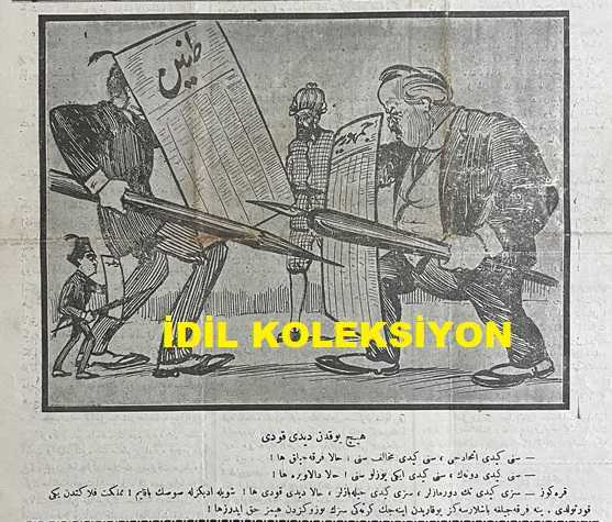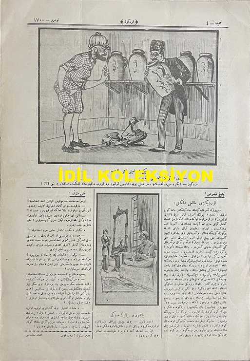 Osmanlıca Karagöz Mizah Dergisi-Gazetesi, Orijinal Dönem Basım, (Ottoman Magazine-Newspaper-Journal Illustré Cara-Gueuz) - 2 Temmuz 1924 - Sayı: 1700 - Hicri: 1 Zilhicce 1342 - Rumi: 2 Temmuz 1340 - Tanin ve Cumhuriyet Gazetelerinin İttihatçılık Üzerine Atışmalarına Dair Karikatür: Hiç Yoktan Dedikodu "Karagöz: Sizi Gidi Tek Durmazlar, Sizi Gidi Cambazlar, Hala Dedikodu Ha! Şöyle Edebinizle Susun Bakayım! Memleket Felaketten Yeni Kurtuldu. Yine Fırkacılığa Başlarsanız Yukarıdan İnecek Köteği Sizin Yüzünüzden Hepimiz Hak Ederiz ha!" - İstanbul Şehremini Emin Erkul'u Tasvir Eden Karikatür: Yeni Şehremini İş Başında! "Bu da Öteki Gibi İttihatçı Kokuyor! Karagöz: A Beyim, Sen de Tuhafsın ya, Her Şeyi Böyle İttihatçı Kokuyor Diye Kırıp Dağıtırsan Memlekette Sağlam Bir Şey Kalmaz!" - Karikatür: Yağmur ve Sellerin Sonu, Burhan Cahit (MORKAYA) tarafından kaleme alınmıştır. Kitap 1924 yılında Ali Fuat ve Şürekası Karagöz Gazetesi Şirketi tarafından [İstanbul] yayınlanmıştır. Satışta olan kitap, yayınevinin 1.700. baskısıdır. 4 sayfadır. Osmanlıca Karagöz Mizah Dergisi-Gazetesi, Orijinal Dönem Basım, (Ottoman Magazine-Newspaper-Journal Illustré Cara-Gueuz) - 2 Temmuz 1924 - Sayı: 1700 - Hicri: 1 Zilhicce 1342 - Rumi: 2 Temmuz 1340 - Tanin ve Cumhuriyet Gazetelerinin İttihatçılık Üzerine Atışmalarına Dair Karikatür: Hiç Yoktan Dedikodu "Karagöz: Sizi Gidi Tek Durmazlar, Sizi Gidi Cambazlar, Hala Dedikodu Ha! Şöyle Edebinizle Susun Bakayım! Memleket Felaketten Yeni Kurtuldu. Yine Fırkacılığa Başlarsanız Yukarıdan İnecek Köteği Sizin Yüzünüzden Hepimiz Hak Ederiz ha!" - İstanbul Şehremini Emin Erkul'u Tasvir Eden Karikatür: Yeni Şehremini İş Başında! "Bu da Öteki Gibi İttihatçı Kokuyor! Karagöz: A Beyim, Sen de Tuhafsın ya, Her Şeyi Böyle İttihatçı Kokuyor Diye Kırıp Dağıtırsan Memlekette Sağlam Bir Şey Kalmaz!" - Karikatür: Yağmur ve Sellerin Sonu adlı eser Osmanlıca dilindedir.