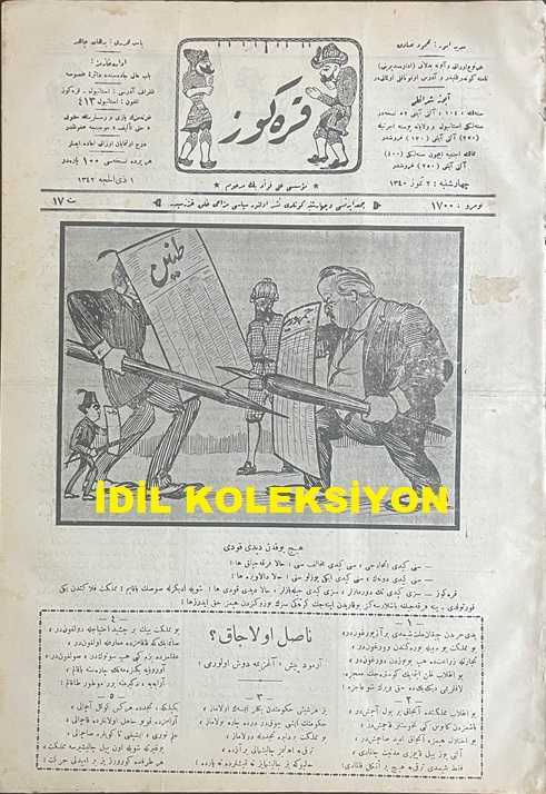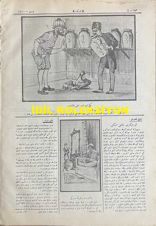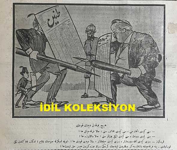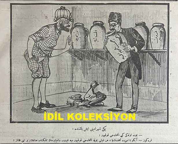 Osmanlıca Karagöz Mizah Dergisi-Gazetesi, Orijinal Dönem Basım, (Ottoman Magazine-Newspaper-Journal Illustré Cara-Gueuz) - 2 Temmuz 1924 - Sayı: 1700 - Hicri: 1 Zilhicce 1342 - Rumi: 2 Temmuz 1340 - Tanin ve Cumhuriyet Gazetelerinin İttihatçılık Üzerine Atışmalarına Dair Karikatür: Hiç Yoktan Dedikodu "Karagöz: Sizi Gidi Tek Durmazlar, Sizi Gidi Cambazlar, Hala Dedikodu Ha! Şöyle Edebinizle Susun Bakayım! Memleket Felaketten Yeni Kurtuldu. Yine Fırkacılığa Başlarsanız Yukarıdan İnecek Köteği Sizin Yüzünüzden Hepimiz Hak Ederiz ha!" - İstanbul Şehremini Emin Erkul'u Tasvir Eden Karikatür: Yeni Şehremini İş Başında! "Bu da Öteki Gibi İttihatçı Kokuyor! Karagöz: A Beyim, Sen de Tuhafsın ya, Her Şeyi Böyle İttihatçı Kokuyor Diye Kırıp Dağıtırsan Memlekette Sağlam Bir Şey Kalmaz!" - Karikatür: Yağmur ve Sellerin Sonu