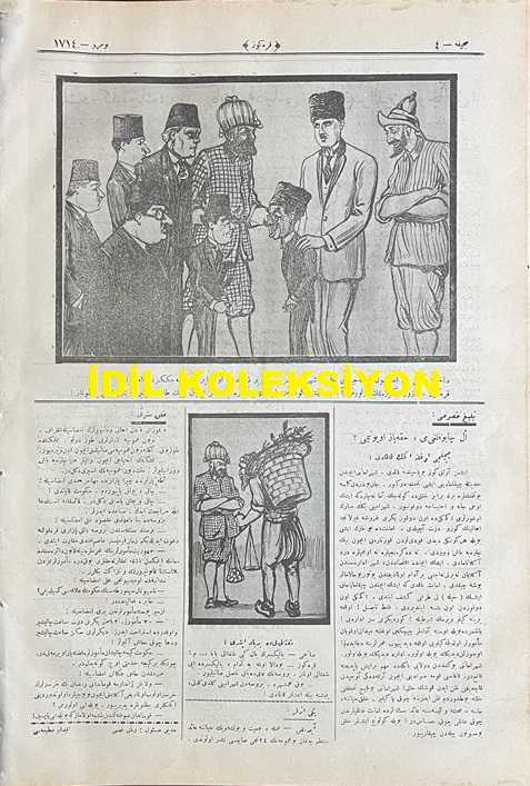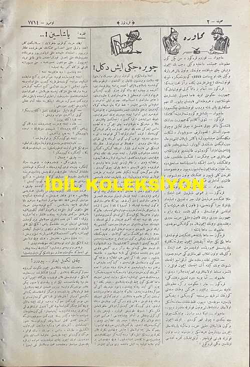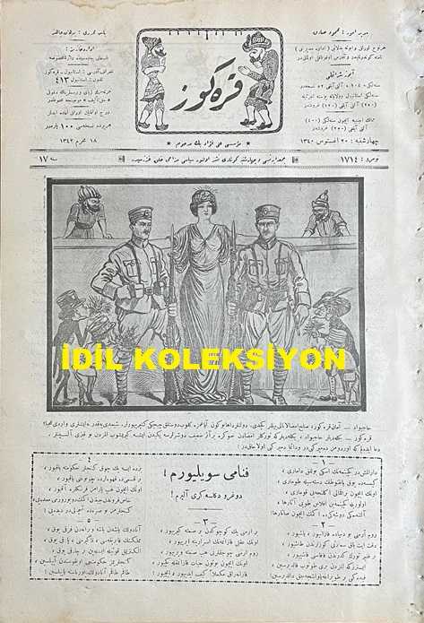 Osmanlıca Karagöz Mizah Dergisi-Gazetesi, Orijinal Dönem Basım, (Ottoman Magazine-Newspaper-Journal Illustré Cara-Gueuz) - 20 Ağustos 1924 - Sayı: 1714 - Hicri: 18 Muharrem 1342 - Rumi: 20 Ağustos 1340 - Karikatür: "Hacivat: Aman Karagöz, Sulh İmzalanalı Yıllar Geçti. Devletler Daha Bugün Ayağımıza Gelip Dostluk Çiçeği Getiriyorlar. Şimdiye Kadar Ne İşleri Vardı Acaba? Karagöz: Beklediler Hacivat, Beklediler ki Türkler İmzadan Sonra Biraz Zayıf Düşerlerse Yeniden İşe Girişip Elimizden Bu Kızı Alsınlar. Dua Edelim ki Ordumuz Demir Gibidir ve Daima Demir Gibi Olacaktır!" - Karikatür: "Dahiliye Vekili: İstanbul Gazetecileri Beyler, Şehreminimiz Sevimli Bir Zattır. Onu Er Geç Beğeneceğinizden Eminim! Karagöz: Zorla Güzellik Olur mu A Beyim, İşte Gözümüz Tutmadı Bir Kere! Hatır İçin Çiğ Tavuk Yenir Amma Şehremini Yutulmaz!" adlı eser, Kitap > Süreli Yayınlar > Gazeteler > Türkiye > Genel kategorisinde İkinci El olarak satıştadır.