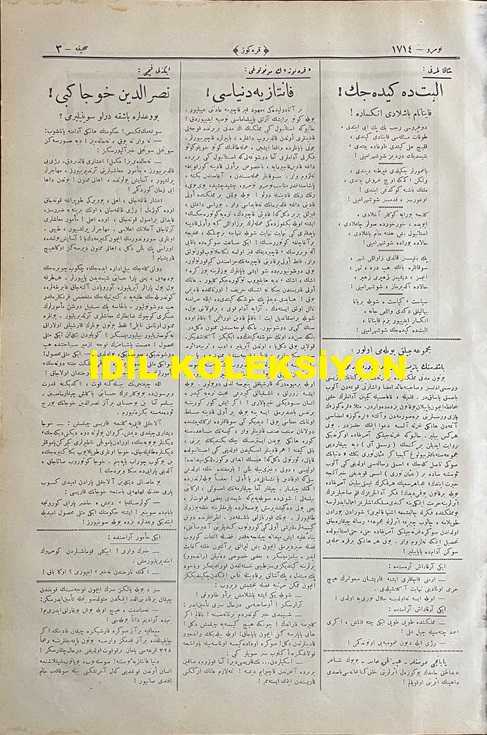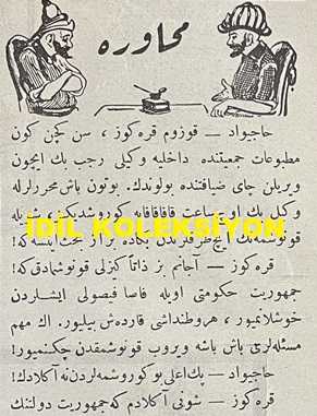 Osmanlıca Karagöz Mizah Dergisi-Gazetesi, Orijinal Dönem Basım, (Ottoman Magazine-Newspaper-Journal Illustré Cara-Gueuz) - 20 Ağustos 1924 - Sayı: 1714 - Hicri: 18 Muharrem 1342 - Rumi: 20 Ağustos 1340 - Karikatür: "Hacivat: Aman Karagöz, Sulh İmzalanalı Yıllar Geçti. Devletler Daha Bugün Ayağımıza Gelip Dostluk Çiçeği Getiriyorlar. Şimdiye Kadar Ne İşleri Vardı Acaba? Karagöz: Beklediler Hacivat, Beklediler ki Türkler İmzadan Sonra Biraz Zayıf Düşerlerse Yeniden İşe Girişip Elimizden Bu Kızı Alsınlar. Dua Edelim ki Ordumuz Demir Gibidir ve Daima Demir Gibi Olacaktır!" - Karikatür: "Dahiliye Vekili: İstanbul Gazetecileri Beyler, Şehreminimiz Sevimli Bir Zattır. Onu Er Geç Beğeneceğinizden Eminim! Karagöz: Zorla Güzellik Olur mu A Beyim, İşte Gözümüz Tutmadı Bir Kere! Hatır İçin Çiğ Tavuk Yenir Amma Şehremini Yutulmaz!", Burhan Cahit (MORKAYA) tarafından kaleme alınmıştır. Kitap 1924 yılında Ali Fuat ve Şürekası Karagöz Gazetesi Şirketi tarafından [İstanbul] yayınlanmıştır. Satışta olan kitap, yayınevinin 1.714. baskısıdır. 4 sayfadır. Osmanlıca Karagöz Mizah Dergisi-Gazetesi, Orijinal Dönem Basım, (Ottoman Magazine-Newspaper-Journal Illustré Cara-Gueuz) - 20 Ağustos 1924 - Sayı: 1714 - Hicri: 18 Muharrem 1342 - Rumi: 20 Ağustos 1340 - Karikatür: "Hacivat: Aman Karagöz, Sulh İmzalanalı Yıllar Geçti. Devletler Daha Bugün Ayağımıza Gelip Dostluk Çiçeği Getiriyorlar. Şimdiye Kadar Ne İşleri Vardı Acaba? Karagöz: Beklediler Hacivat, Beklediler ki Türkler İmzadan Sonra Biraz Zayıf Düşerlerse Yeniden İşe Girişip Elimizden Bu Kızı Alsınlar. Dua Edelim ki Ordumuz Demir Gibidir ve Daima Demir Gibi Olacaktır!" - Karikatür: "Dahiliye Vekili: İstanbul Gazetecileri Beyler, Şehreminimiz Sevimli Bir Zattır. Onu Er Geç Beğeneceğinizden Eminim! Karagöz: Zorla Güzellik Olur mu A Beyim, İşte Gözümüz Tutmadı Bir Kere! Hatır İçin Çiğ Tavuk Yenir Amma Şehremini Yutulmaz!" adlı eser Osmanlıca dilindedir.