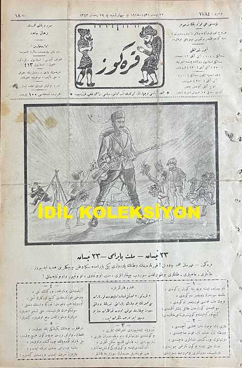 Osmanlıca Karagöz Mizah Dergisi-Gazetesi, Orijinal Dönem Basım, (Ottoman Magazine-Newspaper-Journal Illustré Cara-Gueuz) - 22 Nisan 1925 - Sayı: 1784 - Hicri: 29 Ramazan 1343 - 23 Nisan Temalı Kapak Karikatürü: 23 Nisan-Millet Bayramı "Karagöz: Kahraman Mehmet Çavuş! Kurtardığın Vatanın Yavruları Yeni Bayramda Sana Vatan Çiçeklerini Hediye Ediyorlar. Hainleri, Asileri, Zalimleri Bu Topraktan Sürüp Çıkaranları, Millet Unutmadı, Unutmuyor ve Unutmayacak!" - Karikatür: Bulgaristan'da Bolşevik İhtilali! "Hacivat: Aman Karagöz. Bu İş Gittikçe Sarpa Sarıyor. Bugün Sofya'da Patlayan Bombanın Yarın Belgrat'ta, Öbür Gün Bükreş'te Yüzlerce Binlerce Zavallıyı Mahvetmeyeceğini Kim Temin Eder. Karagöz: Doğru Söylüyorsun Hacivat, Bana Kalsa Bu Tehlikeye Komşu Devletler Hep Beraber Karşı Durmaya Çalışmalı, Yoksa Balkanlar Tırtıl Üşmüş Çam Ağacına Dönecek ha!", Burhan Cahit (MORKAYA) tarafından kaleme alınmıştır. Kitap 1925 yılında Ali Fuat ve Şürekası Karagöz Gazetesi Şirketi tarafından [İstanbul] yayınlanmıştır. Satışta olan kitap, yayınevinin 1.784. baskısıdır. 4 sayfadır. Osmanlıca Karagöz Mizah Dergisi-Gazetesi, Orijinal Dönem Basım, (Ottoman Magazine-Newspaper-Journal Illustré Cara-Gueuz) - 22 Nisan 1925 - Sayı: 1784 - Hicri: 29 Ramazan 1343 - 23 Nisan Temalı Kapak Karikatürü: 23 Nisan-Millet Bayramı "Karagöz: Kahraman Mehmet Çavuş! Kurtardığın Vatanın Yavruları Yeni Bayramda Sana Vatan Çiçeklerini Hediye Ediyorlar. Hainleri, Asileri, Zalimleri Bu Topraktan Sürüp Çıkaranları, Millet Unutmadı, Unutmuyor ve Unutmayacak!" - Karikatür: Bulgaristan'da Bolşevik İhtilali! "Hacivat: Aman Karagöz. Bu İş Gittikçe Sarpa Sarıyor. Bugün Sofya'da Patlayan Bombanın Yarın Belgrat'ta, Öbür Gün Bükreş'te Yüzlerce Binlerce Zavallıyı Mahvetmeyeceğini Kim Temin Eder. Karagöz: Doğru Söylüyorsun Hacivat, Bana Kalsa Bu Tehlikeye Komşu Devletler Hep Beraber Karşı Durmaya Çalışmalı, Yoksa Balkanlar Tırtıl Üşmüş Çam Ağacına Dönecek ha!" adlı eser Osmanlıca dilindedir.