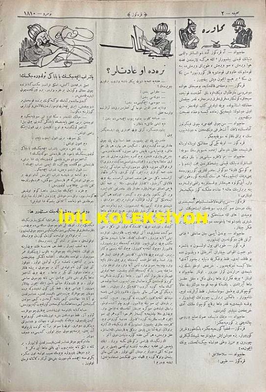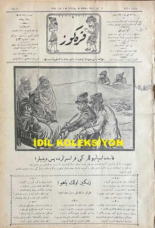 Osmanlıca Karagöz Mizah Dergisi-Gazetesi, Orijinal Dönem Basım, (Ottoman Magazine-Newspaper-Journal Illustré Cara-Gueuz) - 22 Temmuz 1925 - Sayı: 1810 - Hicri: 1 Muharrem 1344 - Rumi: 22 Temmuz 1341 - Karikatür: Fas'ta İspanyollar Gibi Fransızlar da Pes Dediler! "Hacivat: Lakin Fransızlar Attılar Tuttular, Şu Kadar Tayyare, Bu Kadar Asker Gönderdiler Amma Nihayet Yine Faslılara Pes Dediler Yahu! Karagöz: İstiklaline, Hürriyetine Tecavüz Edilen Milletler Bir Avuç da Olsalar Cihana Meydan Okurlar. Yeter ki O Millette Bizdeki Gibi Şeref ve Namus Damarı Kuvvetli Olsun" - Karikatür: Sırpların Selanik Derdi Yine Kabardı! "Sırplı: Ey Yunan Komşu, Dostluk Kantarla Alışveriş Miskalle, Şuradan Açıl Bakayım da Biz de Biraz Deniz Havası Alalım. Karagöz: Dayan Çorbacı Dayan, Bak Eski Dostlarınla Hesap Günü Geldi. Haydi Göreyim Sizi Şöyle Bir Kapışın Bakayım!", Burhan Cahit (MORKAYA) tarafından kaleme alınmıştır. Kitap 1925 yılında Ali Fuat ve Şürekası Karagöz Gazetesi Şirketi tarafından [İstanbul] yayınlanmıştır. Satışta olan kitap, yayınevinin 1.810. baskısıdır. 4 sayfadır. Osmanlıca Karagöz Mizah Dergisi-Gazetesi, Orijinal Dönem Basım, (Ottoman Magazine-Newspaper-Journal Illustré Cara-Gueuz) - 22 Temmuz 1925 - Sayı: 1810 - Hicri: 1 Muharrem 1344 - Rumi: 22 Temmuz 1341 - Karikatür: Fas'ta İspanyollar Gibi Fransızlar da Pes Dediler! "Hacivat: Lakin Fransızlar Attılar Tuttular, Şu Kadar Tayyare, Bu Kadar Asker Gönderdiler Amma Nihayet Yine Faslılara Pes Dediler Yahu! Karagöz: İstiklaline, Hürriyetine Tecavüz Edilen Milletler Bir Avuç da Olsalar Cihana Meydan Okurlar. Yeter ki O Millette Bizdeki Gibi Şeref ve Namus Damarı Kuvvetli Olsun" - Karikatür: Sırpların Selanik Derdi Yine Kabardı! "Sırplı: Ey Yunan Komşu, Dostluk Kantarla Alışveriş Miskalle, Şuradan Açıl Bakayım da Biz de Biraz Deniz Havası Alalım. Karagöz: Dayan Çorbacı Dayan, Bak Eski Dostlarınla Hesap Günü Geldi. Haydi Göreyim Sizi Şöyle Bir Kapışın Bakayım!" adlı eser Osmanlıca dilindedir.