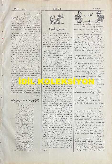 Osmanlıca Karagöz Mizah Dergisi-Gazetesi, Orijinal Dönem Basım, (Ottoman Magazine-Newspaper-Journal Illustré Cara-Gueuz) - 23 Ocak 1924 - Sayı: 1654 - Hicri: 16 Cemaziyelahir 1342 - Rumi: 23 Kanun-i Sani 1340 - Karikatür: Avrupa'nın Bugünkü Siyasi Haritası "Hacivat: Aferin İngilizlerin Şu Amele Fırkasına! İş Başına Geçince İlk İşleri Dünyanın Umumi Barışıklığına Çare Aramak Oldu! Karagöz: Dikkat Et Hacivat İngilizlerin İki Yüz Yıllık Politikası Değişiyor, Eminim ki Bundan Sonra Dünya Yüzünde Haksızlık Azalacaktır!" - Karikatür: Mebuslarımız Yüz Lira Zam Daha Alırken "Köylü Dayı: Aklım Ermedi Gitti Yahu! Siz Hani Bu Yıl Öşrü Eksik Alacaktınız, Hani Tohumluk Verecektiniz. Hepsinden Vazgeçtim Bizim Ekmeklik de Caba Gidiyor. Karagöz: Baksana Köylü Dayı Şu Ambara Ne Attıksa Dolmadı, Sen Hele Bu Yıl Dişini Sıkıver, Zorla Değil Ya Senin Ekmek Bize Tatlı Geliyor Vesselam!", Burhan Cahit (MORKAYA) tarafından kaleme alınmıştır. Kitap 1924 yılında Ali Fuat ve Şürekası Karagöz Gazetesi Şirketi tarafından [İstanbul] yayınlanmıştır. Satışta olan kitap, yayınevinin 1.654. baskısıdır. 4 sayfadır. Osmanlıca Karagöz Mizah Dergisi-Gazetesi, Orijinal Dönem Basım, (Ottoman Magazine-Newspaper-Journal Illustré Cara-Gueuz) - 23 Ocak 1924 - Sayı: 1654 - Hicri: 16 Cemaziyelahir 1342 - Rumi: 23 Kanun-i Sani 1340 - Karikatür: Avrupa'nın Bugünkü Siyasi Haritası "Hacivat: Aferin İngilizlerin Şu Amele Fırkasına! İş Başına Geçince İlk İşleri Dünyanın Umumi Barışıklığına Çare Aramak Oldu! Karagöz: Dikkat Et Hacivat İngilizlerin İki Yüz Yıllık Politikası Değişiyor, Eminim ki Bundan Sonra Dünya Yüzünde Haksızlık Azalacaktır!" - Karikatür: Mebuslarımız Yüz Lira Zam Daha Alırken "Köylü Dayı: Aklım Ermedi Gitti Yahu! Siz Hani Bu Yıl Öşrü Eksik Alacaktınız, Hani Tohumluk Verecektiniz. Hepsinden Vazgeçtim Bizim Ekmeklik de Caba Gidiyor. Karagöz: Baksana Köylü Dayı Şu Ambara Ne Attıksa Dolmadı, Sen Hele Bu Yıl Dişini Sıkıver, Zorla Değil Ya Senin Ekmek Bize Tatlı Geliyor Vesselam!" adlı eser Osmanlıca dilindedir.