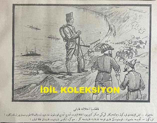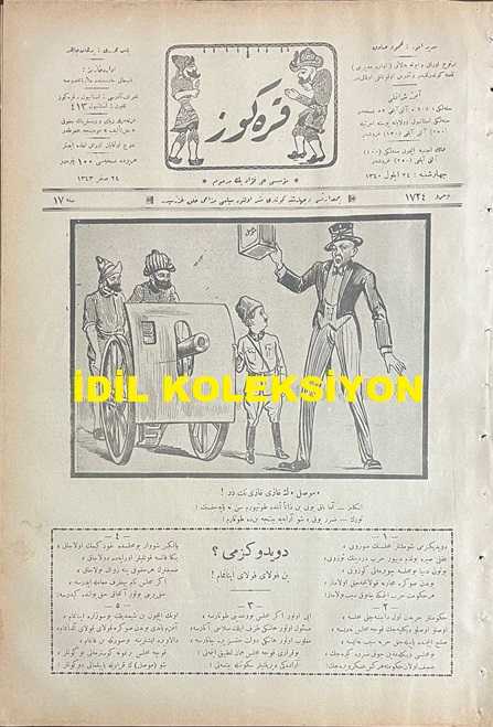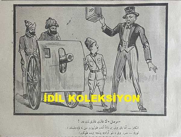 Osmanlıca Karagöz Mizah Dergisi-Gazetesi, Orijinal Dönem Basım, (Ottoman Magazine-Newspaper-Journal Illustré Cara-Gueuz) - 24 Eylül 1924 - Sayı: 1724 - Hicri: 24 Safer 1342 - Rumi: 24 Eylül 1340 - Musul Meselesine Dair İsmet İnönü'yü Tasvir Eden Karikatür: Musul'un Gazı Gazi'nindir! "İngiliz: Ama Bak Bunu Ben Zaten Elimde Tutuyorum Sen Ne Yapacaksın! Türk: Zarar Yok, Şu Arabaya Binince Ben de Tutarım!" - Karikatür: Kafkasya İhtilaline Karşı "Hacivat: İş Kızıştı Karagöz, Bolşevikler Gemi Gemi Asker Getiriyor İhtilalciler de Avuç Avuç Kurşun Harcıyorlar, Baksana Top Sesleri Bize Kadar Geliyor! Karagöz: Aldırma Hacivat. Komşudaki Karı Koca Kavgasına Karışmaya Gelmez. Sonra İkisi Barışır da Karışan Kaka Olur!" - Karikatür: İstanbul Fıskiyesi, Üsküdar Kerbelası, Burhan Cahit (MORKAYA) tarafından kaleme alınmıştır. Kitap 1924 yılında Ali Fuat ve Şürekası Karagöz Gazetesi Şirketi tarafından [İstanbul] yayınlanmıştır. Satışta olan kitap, yayınevinin 1.724. baskısıdır. 4 sayfadır. Osmanlıca Karagöz Mizah Dergisi-Gazetesi, Orijinal Dönem Basım, (Ottoman Magazine-Newspaper-Journal Illustré Cara-Gueuz) - 24 Eylül 1924 - Sayı: 1724 - Hicri: 24 Safer 1342 - Rumi: 24 Eylül 1340 - Musul Meselesine Dair İsmet İnönü'yü Tasvir Eden Karikatür: Musul'un Gazı Gazi'nindir! "İngiliz: Ama Bak Bunu Ben Zaten Elimde Tutuyorum Sen Ne Yapacaksın! Türk: Zarar Yok, Şu Arabaya Binince Ben de Tutarım!" - Karikatür: Kafkasya İhtilaline Karşı "Hacivat: İş Kızıştı Karagöz, Bolşevikler Gemi Gemi Asker Getiriyor İhtilalciler de Avuç Avuç Kurşun Harcıyorlar, Baksana Top Sesleri Bize Kadar Geliyor! Karagöz: Aldırma Hacivat. Komşudaki Karı Koca Kavgasına Karışmaya Gelmez. Sonra İkisi Barışır da Karışan Kaka Olur!" - Karikatür: İstanbul Fıskiyesi, Üsküdar Kerbelası adlı eser Osmanlıca dilindedir.