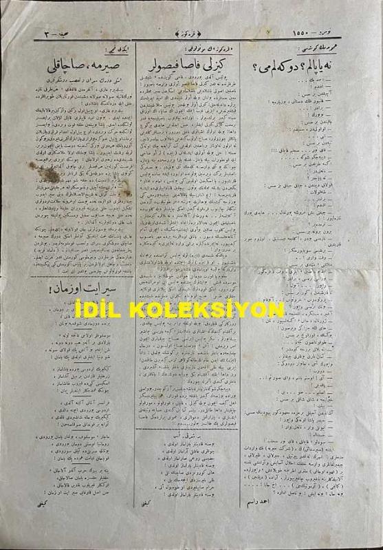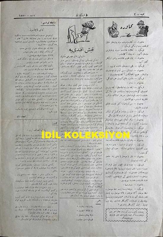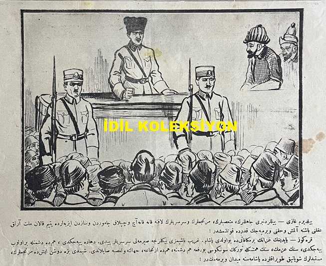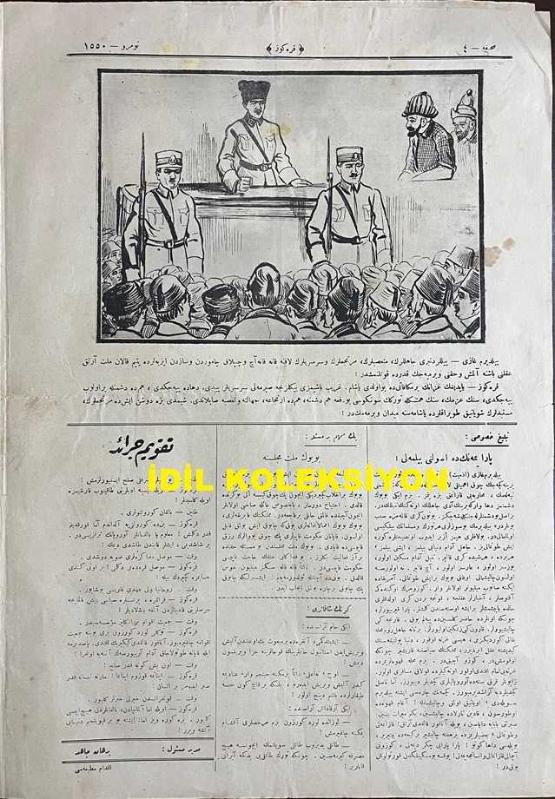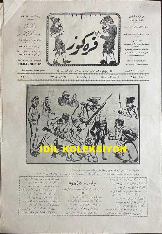 Osmanlıca Karagöz Mizah Dergisi-Gazetesi, Orijinal Dönem Basım, (Ottoman Magazine-Newspaper-Journal Illustré Cara-Gueuz) - 24 Ocak 1923 - Sayı: 1550 - Hicri: 6 Cemaziyelahir 1341 - Rumi: 24 Kanun-i Sani 1339 - Atatürk'ü Tasvir Eden Karikatür: "Hacivat: On Beş Güne Kadar Sulh Yapacaklarmış, Demek Sulha Hazırlanıyorlar! Karagöz: Devletler Sulha mı Hazırlanıyorlar, Yoksa Kikirikler Yeni Bir Oyuna mı Hazırlanıyorlar Orasını Allah Bilir!" - "Yıldırım Gazi'ye" Cepheleri Teftiş Ederken Mehmetçik Tarafından Okunmuştur - Amcamın Köşesi: "Ne Yapalım? Dökelim mi?" Ahmet Rasim - İğneli Fıçı: "Sırma, Saçaklı" Eski Devrin Saray ve Taassup Düşkünleri - Atatürk'ü Tasvir Eden Karikatür: Yıldırım Gazi - Tebliğ-i Hususi: Para Yemenin de Usulünü Bilmeli! Yıldırım Gazi İzmit'te Türk ve İslama Öz Nasihat Yerine Geçecek Çok Ehemmiyetli Laflar Söyledi Dedi ki: "Düşmanı Tepelemek, Muharebeyi Kazanmak Bize Yetmez. Bizim İki Büyük Düşmanımız Daha Var ki Birinin Adı Cahillik Ötekinin Tembelliktir", Burhan Cahit (MORKAYA) tarafından kaleme alınmıştır. Kitap 1923 yılında Ali Fuat ve Şürekası Karagöz Gazetesi Şirketi tarafından [İstanbul] yayınlanmıştır. Satışta olan kitap, yayınevinin 1.550. baskısıdır. 4 sayfadır. Osmanlıca Karagöz Mizah Dergisi-Gazetesi, Orijinal Dönem Basım, (Ottoman Magazine-Newspaper-Journal Illustré Cara-Gueuz) - 24 Ocak 1923 - Sayı: 1550 - Hicri: 6 Cemaziyelahir 1341 - Rumi: 24 Kanun-i Sani 1339 - Atatürk'ü Tasvir Eden Karikatür: "Hacivat: On Beş Güne Kadar Sulh Yapacaklarmış, Demek Sulha Hazırlanıyorlar! Karagöz: Devletler Sulha mı Hazırlanıyorlar, Yoksa Kikirikler Yeni Bir Oyuna mı Hazırlanıyorlar Orasını Allah Bilir!" - "Yıldırım Gazi'ye" Cepheleri Teftiş Ederken Mehmetçik Tarafından Okunmuştur - Amcamın Köşesi: "Ne Yapalım? Dökelim mi?" Ahmet Rasim - İğneli Fıçı: "Sırma, Saçaklı" Eski Devrin Saray ve Taassup Düşkünleri - Atatürk'ü Tasvir Eden Karikatür: Yıldırım Gazi - Tebliğ-i Hususi: Para Yemenin de Usulünü Bilmeli! Yıldırım Gazi İzmit'te Türk ve İslama Öz Nasihat Yerine Geçecek Çok Ehemmiyetli Laflar Söyledi Dedi ki: "Düşmanı Tepelemek, Muharebeyi Kazanmak Bize Yetmez. Bizim İki Büyük Düşmanımız Daha Var ki Birinin Adı Cahillik Ötekinin Tembelliktir" adlı eser Osmanlıca dilindedir.