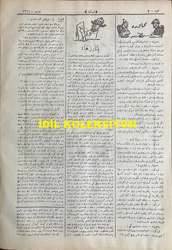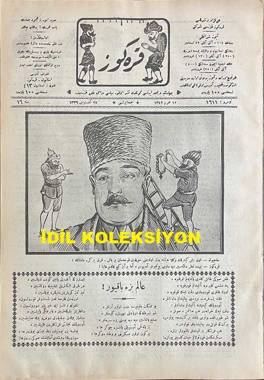 Osmanlıca Karagöz Mizah Dergisi-Gazetesi, Orijinal Dönem Basım, (Ottoman Magazine-Newspaper-Journal Illustré Cara-Gueuz) - 25 Ağustos 1923 - Sayı: 1611 - Hicri: 12 Muharrem 1342 - Rumi: 25 Ağustos 1339 - Karikatür: "Hacivat; On Beş Kişilik Vükela Heyetine Bedel Olduğunu Söyleyen Kocaman Bir Baş. Kırk Bir Kere Maşallah! Karagöz: Ben de Nazar Değmesin Diye Mavi Boncuk Asıyorum, Amma Biraz Geç Kaldım Galiba!" - Amcamın Köşesi: "Leyla mı Bulunmaz!" Muharriri: Ahmet Rasim - Karikatür: Para ile Değil Sıra ile! "Merkez İstanbul İken Köylü: Kuzum Beyim, Hükümet Kapısında Bir Davamız Var. Ta Memleketten Buraya Geldim, Kurban Olayım, Sevabına Adliye Nezaretini Gosterivir! Merkez Ankara'da Olunca İstanbullu: Aman Köylü Dayı, Hükümette Ufak Biri İşim Var. İstanbul'dan Buraya Kadar Öldüm, Bittim, Geldim, Kuzum Bana Dahiliye Vekaletini Gösterir misin!", Burhan Cahit (MORKAYA) tarafından kaleme alınmıştır. Kitap 1923 yılında Ali Fuat ve Şürekası Karagöz Gazetesi Şirketi tarafından [İstanbul] yayınlanmıştır. Satışta olan kitap, yayınevinin 1.611. baskısıdır. 4 sayfadır. Osmanlıca Karagöz Mizah Dergisi-Gazetesi, Orijinal Dönem Basım, (Ottoman Magazine-Newspaper-Journal Illustré Cara-Gueuz) - 25 Ağustos 1923 - Sayı: 1611 - Hicri: 12 Muharrem 1342 - Rumi: 25 Ağustos 1339 - Karikatür: "Hacivat; On Beş Kişilik Vükela Heyetine Bedel Olduğunu Söyleyen Kocaman Bir Baş. Kırk Bir Kere Maşallah! Karagöz: Ben de Nazar Değmesin Diye Mavi Boncuk Asıyorum, Amma Biraz Geç Kaldım Galiba!" - Amcamın Köşesi: "Leyla mı Bulunmaz!" Muharriri: Ahmet Rasim - Karikatür: Para ile Değil Sıra ile! "Merkez İstanbul İken Köylü: Kuzum Beyim, Hükümet Kapısında Bir Davamız Var. Ta Memleketten Buraya Geldim, Kurban Olayım, Sevabına Adliye Nezaretini Gosterivir! Merkez Ankara'da Olunca İstanbullu: Aman Köylü Dayı, Hükümette Ufak Biri İşim Var. İstanbul'dan Buraya Kadar Öldüm, Bittim, Geldim, Kuzum Bana Dahiliye Vekaletini Gösterir misin!" adlı eser Osmanlıca dilindedir.
