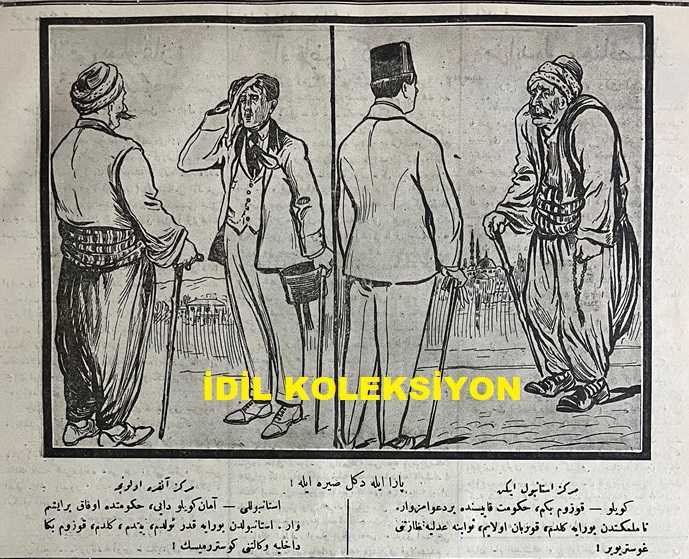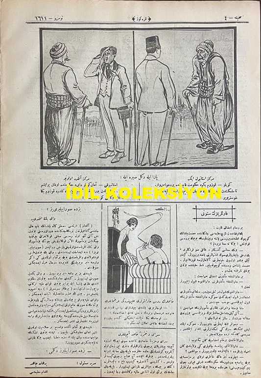 Osmanlıca Karagöz Mizah Dergisi-Gazetesi, Orijinal Dönem Basım, (Ottoman Magazine-Newspaper-Journal Illustré Cara-Gueuz) - 25 Ağustos 1923 - Sayı: 1611 - Hicri: 12 Muharrem 1342 - Rumi: 25 Ağustos 1339 - Karikatür: "Hacivat; On Beş Kişilik Vükela Heyetine Bedel Olduğunu Söyleyen Kocaman Bir Baş. Kırk Bir Kere Maşallah! Karagöz: Ben de Nazar Değmesin Diye Mavi Boncuk Asıyorum, Amma Biraz Geç Kaldım Galiba!" - Amcamın Köşesi: "Leyla mı Bulunmaz!" Muharriri: Ahmet Rasim - Karikatür: Para ile Değil Sıra ile! "Merkez İstanbul İken Köylü: Kuzum Beyim, Hükümet Kapısında Bir Davamız Var. Ta Memleketten Buraya Geldim, Kurban Olayım, Sevabına Adliye Nezaretini Gosterivir! Merkez Ankara'da Olunca İstanbullu: Aman Köylü Dayı, Hükümette Ufak Biri İşim Var. İstanbul'dan Buraya Kadar Öldüm, Bittim, Geldim, Kuzum Bana Dahiliye Vekaletini Gösterir misin!" adlı eser, Kitap > Süreli Yayınlar > Gazeteler > Türkiye > Genel kategorisinde İkinci El olarak satıştadır.