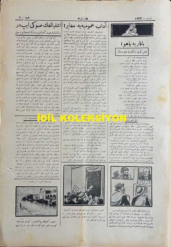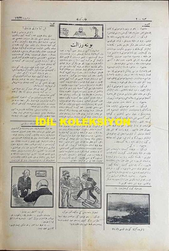 Osmanlıca Karagöz Mizah Dergisi-Gazetesi, Orijinal Dönem Basım, (Ottoman Magazine-Newspaper-Journal Illustré Cara-Gueuz) - 25 Eylül 1926 - Sayı: 1933 - Karikatürist Kozma Togo'nun Çalışması: Pangalos Hapse Girmeseydi, Harbe Girecekmiş! "Atina Hapishanesinde Pangalos: Ah Vire Diyavlo, Şu Kondilis Beni Zindana Atmasaydı Türklere Bir Harp Açacaktım, Bütün Dünyaya Şöhret Salacaktım. Karagöz: Hiç Üzülme Aftos Pangalos, O Zaman da Seni Tutup Zindana Atan İsmet Paşamız Olurdu" - Fotoğraf: Yurdumuzun Güzel Köşelerinden Karadeniz'in Güzel Kıyısı Ünye - Fotoğraf: Yurdumuzun Güzel Köşelerinden Cenubi Anadolu'nun Pırlantası: Güzel Urfa. Görünen Cami, Cami-i Kebir Yanındaki Halilürrahman Suyu - İsmet İnönü'yü Tasvir Eden Karikatür: Fransız Etrafını Görmeden Bize Çalım Satıyor! "Fransız: Ah Gidi Ah, Benim Kaptanımı Tutar, Hapse Atarsın Ha, Gösteririm Ben Sana! Karagöz: Atma be Tangom Camlar Beyliktir. Sen Bize Çalım Satacağına, Yanında Eli Silaha Gidin İtalyan'a Baksan Daha İyi Olur", Burhan Cahit (MORKAYA) tarafından kaleme alınmıştır. Kitap 1926 yılında Ali Fuat ve Şürekası Karagöz Gazetesi Şirketi tarafından [İstanbul] yayınlanmıştır. Satışta olan kitap, yayınevinin 1.933. baskısıdır. 4 sayfadır. Osmanlıca Karagöz Mizah Dergisi-Gazetesi, Orijinal Dönem Basım, (Ottoman Magazine-Newspaper-Journal Illustré Cara-Gueuz) - 25 Eylül 1926 - Sayı: 1933 - Karikatürist Kozma Togo'nun Çalışması: Pangalos Hapse Girmeseydi, Harbe Girecekmiş! "Atina Hapishanesinde Pangalos: Ah Vire Diyavlo, Şu Kondilis Beni Zindana Atmasaydı Türklere Bir Harp Açacaktım, Bütün Dünyaya Şöhret Salacaktım. Karagöz: Hiç Üzülme Aftos Pangalos, O Zaman da Seni Tutup Zindana Atan İsmet Paşamız Olurdu" - Fotoğraf: Yurdumuzun Güzel Köşelerinden Karadeniz'in Güzel Kıyısı Ünye - Fotoğraf: Yurdumuzun Güzel Köşelerinden Cenubi Anadolu'nun Pırlantası: Güzel Urfa. Görünen Cami, Cami-i Kebir Yanındaki Halilürrahman Suyu - İsmet İnönü'yü Tasvir Eden Karikatür: Fransız Etrafını Görmeden Bize Çalım Satıyor! "Fransız: Ah Gidi Ah, Benim Kaptanımı Tutar, Hapse Atarsın Ha, Gösteririm Ben Sana! Karagöz: Atma be Tangom Camlar Beyliktir. Sen Bize Çalım Satacağına, Yanında Eli Silaha Gidin İtalyan'a Baksan Daha İyi Olur" adlı eser Osmanlıca dilindedir.