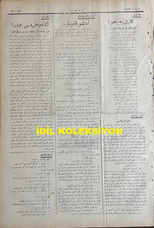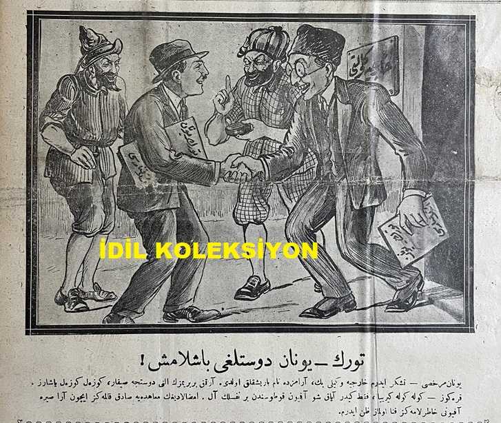 Osmanlıca Karagöz Mizah Dergisi-Gazetesi, Orijinal Dönem Basım, (Ottoman Magazine-Newspaper-Journal Illustré Cara-Gueuz) - 27 Haziran 1925 - Sayı: 1803 - Hicri: 6 Zilhicce 1343 - Rumi: 27 Haziran 1341 - Karikatür: Türk-Yunan Dostluğu Başlamış! "Yunan Murahhası: Teşekkür Ederim Hariciye Vekili Bey, Aramızda Tam Barışıklık Oldu. Artık Birbirimizin Elini Dostça Sıkar, Güzel Güzel Yaşarız. Karagöz: Güle Güle, Fakat Giderayak Şu Afyon Kutusundan Bir Nefeslik Al. İmzaladığın Muahedeye Sadık Kalmanız İçin Ara Sıra Afyonu Hatırlamanız Fena Olmaz Zannederim" - İtalyalı Komşularımız İstanbul'u Gezdiler, Türkiye'nin Gidişinde Bilmem Neler Sezdiler, Kalplerine Ne Doğarsa Defterlere Çizdiler (...) - Karikatür: Denizde, Havada, Silah Başına! "Hacivat: Başka Çare Yok! Hep Komşular Hazırlıkta, Biz de Şu Eski Gemilerimizi, Hele Hele Şu Yavuzumuzu Tamir Ettik mi Değme Düşman Bize Yan Bakamaz. Karagöz: Yaşa Hacivat Yaşa, Sen Gemileri Tamir Et, Ben de Tayyareciliğimi İlerleteyim Bak Bizden İyisi Olur mu?", Burhan Cahit (MORKAYA) tarafından kaleme alınmıştır. Kitap 1925 yılında Ali Fuat ve Şürekası Karagöz Gazetesi Şirketi tarafından [İstanbul] yayınlanmıştır. Satışta olan kitap, yayınevinin 1.803. baskısıdır. 4 sayfadır. Osmanlıca Karagöz Mizah Dergisi-Gazetesi, Orijinal Dönem Basım, (Ottoman Magazine-Newspaper-Journal Illustré Cara-Gueuz) - 27 Haziran 1925 - Sayı: 1803 - Hicri: 6 Zilhicce 1343 - Rumi: 27 Haziran 1341 - Karikatür: Türk-Yunan Dostluğu Başlamış! "Yunan Murahhası: Teşekkür Ederim Hariciye Vekili Bey, Aramızda Tam Barışıklık Oldu. Artık Birbirimizin Elini Dostça Sıkar, Güzel Güzel Yaşarız. Karagöz: Güle Güle, Fakat Giderayak Şu Afyon Kutusundan Bir Nefeslik Al. İmzaladığın Muahedeye Sadık Kalmanız İçin Ara Sıra Afyonu Hatırlamanız Fena Olmaz Zannederim" - İtalyalı Komşularımız İstanbul'u Gezdiler, Türkiye'nin Gidişinde Bilmem Neler Sezdiler, Kalplerine Ne Doğarsa Defterlere Çizdiler (...) - Karikatür: Denizde, Havada, Silah Başına! "Hacivat: Başka Çare Yok! Hep Komşular Hazırlıkta, Biz de Şu Eski Gemilerimizi, Hele Hele Şu Yavuzumuzu Tamir Ettik mi Değme Düşman Bize Yan Bakamaz. Karagöz: Yaşa Hacivat Yaşa, Sen Gemileri Tamir Et, Ben de Tayyareciliğimi İlerleteyim Bak Bizden İyisi Olur mu?" adlı eser Osmanlıca dilindedir.