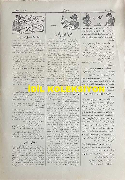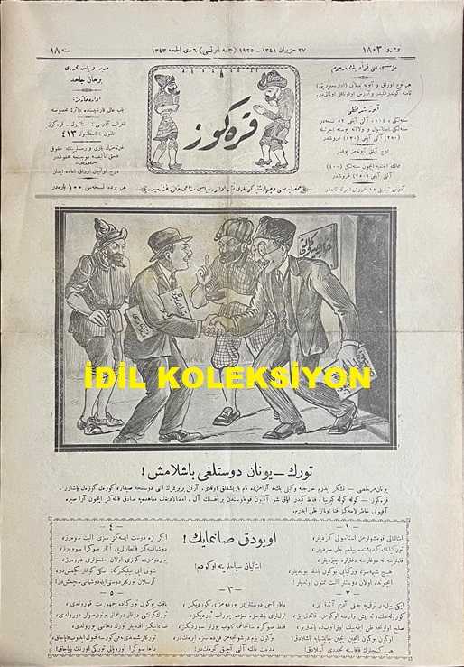 Osmanlıca Karagöz Mizah Dergisi-Gazetesi, Orijinal Dönem Basım, (Ottoman Magazine-Newspaper-Journal Illustré Cara-Gueuz) - 27 Haziran 1925 - Sayı: 1803 - Hicri: 6 Zilhicce 1343 - Rumi: 27 Haziran 1341 - Karikatür: Türk-Yunan Dostluğu Başlamış! "Yunan Murahhası: Teşekkür Ederim Hariciye Vekili Bey, Aramızda Tam Barışıklık Oldu. Artık Birbirimizin Elini Dostça Sıkar, Güzel Güzel Yaşarız. Karagöz: Güle Güle, Fakat Giderayak Şu Afyon Kutusundan Bir Nefeslik Al. İmzaladığın Muahedeye Sadık Kalmanız İçin Ara Sıra Afyonu Hatırlamanız Fena Olmaz Zannederim" - İtalyalı Komşularımız İstanbul'u Gezdiler, Türkiye'nin Gidişinde Bilmem Neler Sezdiler, Kalplerine Ne Doğarsa Defterlere Çizdiler (...) - Karikatür: Denizde, Havada, Silah Başına! "Hacivat: Başka Çare Yok! Hep Komşular Hazırlıkta, Biz de Şu Eski Gemilerimizi, Hele Hele Şu Yavuzumuzu Tamir Ettik mi Değme Düşman Bize Yan Bakamaz. Karagöz: Yaşa Hacivat Yaşa, Sen Gemileri Tamir Et, Ben de Tayyareciliğimi İlerleteyim Bak Bizden İyisi Olur mu?", Burhan Cahit (MORKAYA) tarafından kaleme alınmıştır. Kitap 1925 yılında Ali Fuat ve Şürekası Karagöz Gazetesi Şirketi tarafından [İstanbul] yayınlanmıştır. Satışta olan kitap, yayınevinin 1.803. baskısıdır. 4 sayfadır. Osmanlıca Karagöz Mizah Dergisi-Gazetesi, Orijinal Dönem Basım, (Ottoman Magazine-Newspaper-Journal Illustré Cara-Gueuz) - 27 Haziran 1925 - Sayı: 1803 - Hicri: 6 Zilhicce 1343 - Rumi: 27 Haziran 1341 - Karikatür: Türk-Yunan Dostluğu Başlamış! "Yunan Murahhası: Teşekkür Ederim Hariciye Vekili Bey, Aramızda Tam Barışıklık Oldu. Artık Birbirimizin Elini Dostça Sıkar, Güzel Güzel Yaşarız. Karagöz: Güle Güle, Fakat Giderayak Şu Afyon Kutusundan Bir Nefeslik Al. İmzaladığın Muahedeye Sadık Kalmanız İçin Ara Sıra Afyonu Hatırlamanız Fena Olmaz Zannederim" - İtalyalı Komşularımız İstanbul'u Gezdiler, Türkiye'nin Gidişinde Bilmem Neler Sezdiler, Kalplerine Ne Doğarsa Defterlere Çizdiler (...) - Karikatür: Denizde, Havada, Silah Başına! "Hacivat: Başka Çare Yok! Hep Komşular Hazırlıkta, Biz de Şu Eski Gemilerimizi, Hele Hele Şu Yavuzumuzu Tamir Ettik mi Değme Düşman Bize Yan Bakamaz. Karagöz: Yaşa Hacivat Yaşa, Sen Gemileri Tamir Et, Ben de Tayyareciliğimi İlerleteyim Bak Bizden İyisi Olur mu?" adlı eser Osmanlıca dilindedir.